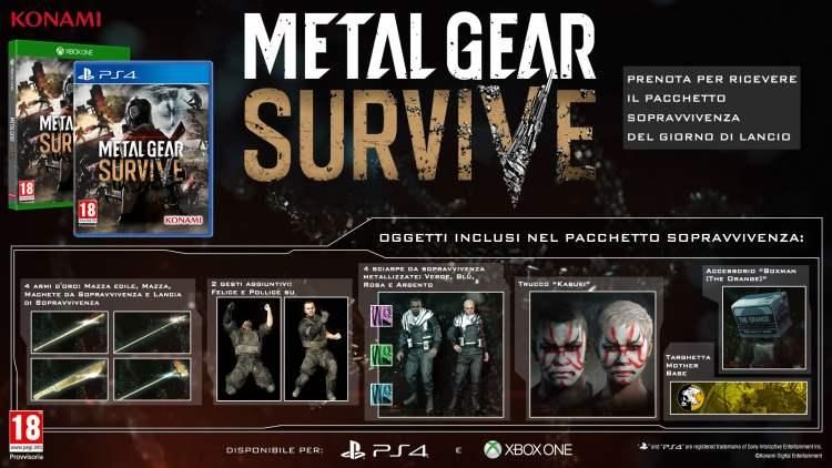 Konami ha annunciato che Metal Gear Survive sarà disponibile in Europa per PlayStation4, Xbox One e PC (via Steam) dal 22 febbraio 2018. Sono stati forniti anche maggiori dettagli relativi alla campagna pre-order. I fan che prenoteranno il gioco riceveranno uno speciale Pacchetto Sopravvivenza che includerà una grande varietà di contenuti extra, disponibili unicamente in questo modo:-4 Armi doro: Mazza Edile, Mazza, Machete da Sopravvivenza e Lancia di Sopravvivenza-4 Sciarpe Metallizzate Da Sopravvivenza: Verde, Blu, rosa e Argento -2 Gesti Aggiuntivi: “Police in Su” e “Felice” -Targhetta Mother Base -Accessorio "BOXMAN [THE ORANGE]” -Trucco “Kabuki”
