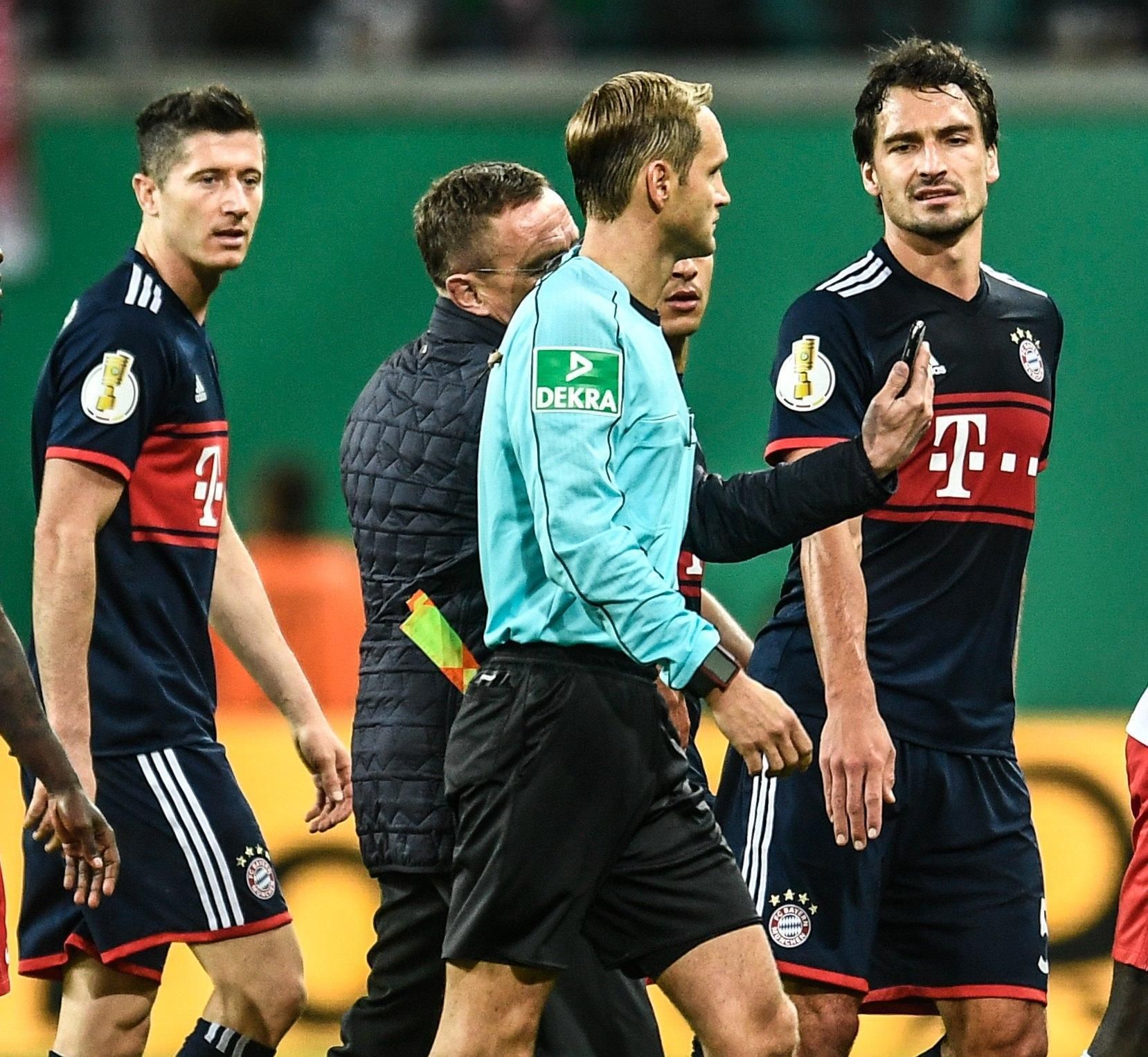 Il Bayern Monaco ha battuto ai calci di rigore in trasferta il Lipsia nei sedicesimi di Coppa di Germania, ma la gara verrà ricordata per un altro motivo. A fine primo tempo, infatti, il direttore sportivo del Lipsia, Ralf Rangnick, ha lasciato il proprio posto in tribuna per scendere in campo. Il motivo? Il direttore di gara ha prima fischiato un rigore per il Lipsia, ma poi, dopo un consulto con il guardalinee, è tornato sulla sua decisione fischiando, correttamente, una punizione dal limite. Al fischio finale del primo tempo Rangnick ha cercato di mostrare con il proprio telefonino all'arbitro, con dei video, che la sua decisione era stata sbagliata. I giocatori del Bayern si sono innervositi per questo atteggiamento e in particolare Hummels. La situazione si è poi calmata, ma sabato le due squadre si ritroveranno ancora contro, questa volta in Bundesliga.