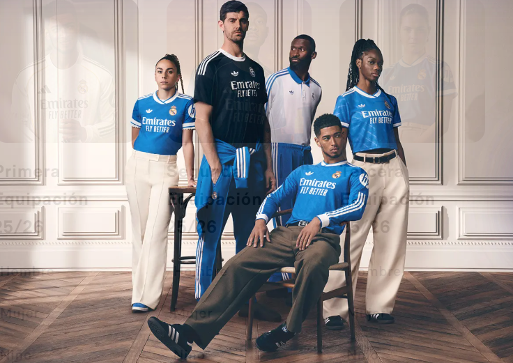 La nuova divisa del club spagnolo è spirata agli iconici sedili blu del vecchio Santiago Bernabéu e fonde la tradizione calcistica del club con l'essenza della cultura contemporanea. Le fasce bianche richiamano la classica scatola delle scarpe Adidas "Bluebird", mentre un sottile motivo diagonale nel tessuto aggiunge consistenza e profondità. All'interno una frase simbolo del madridismo: "90 minuti al Bernabéu sono molto lunghi", pronunciata per la prima volta nel 1985 da Juan Gomez Gonzalez, più noto come Juanito, dopo una sconfitta per 2-0 in semifinale d'andata di Coppa Uefa a San Siro contro l'Inter (al ritorno i Blancos si imposero per 3-0).
