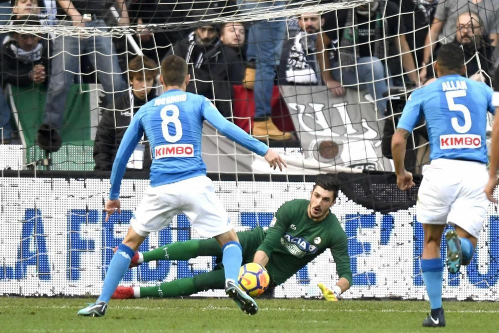 Il Napoli passa a Udine e torna in testa al campionato a +2 sull'Inter. La squadra di Sarri vince 1-0 grazie alla rete di Jorginho, che al 33' fallisce un calcio di rigore (parata di Scuffet) ma poi è bravo a infilare in rete sulla respinta del portiere.