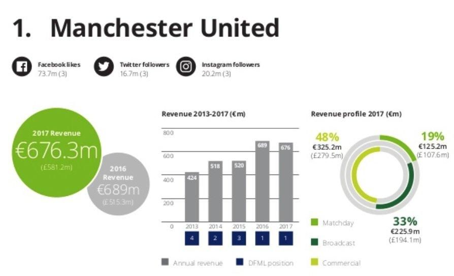 Il Manchester United sul tetto del mondo con 676,3 milioni di euro. I Red Devils alzano al cielo il Deloitte Football Money League 2018 per i ricavi della passata stagione. La squadra di Mourinho ha battuto per 1,7 milioni di euro il Real Madrid campione d'Europa e del mondo in carica. A completare il podio il Barcellona (648,3). La prima squadra italiana è la Juventus che chiude la top ten con ricavi per 405,7 milioni.A seguire l'Inter in quindicesima posizione con 262,1 (un grandissimo balzo avanti con 80 milioni di euro in più rispetto a un anno fa) e il Napoli quattro posizioni più giù con 200,7. Male il Milan che scivola dalla 16.esima posizione alla 21.esima: i ricavi nel giro di un anno sono scesi di 23 milioni di euro, da 214,6 a 191,7. Situazione non rosea anche per la Roma che ha perso la top 20 e ora insegue i rossoneri con 171,8 milioni.