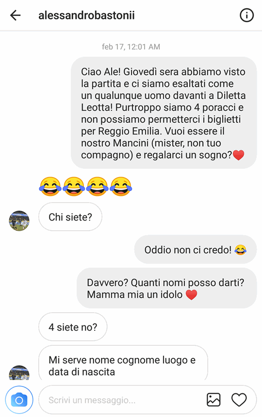 Alessandro Bastoni è uno dei giovani più promettenti dell'Atalanta e prima della gara contro il Borussia è stato protagonista di una singolare vicenda con alcuni tifosi della Dea. Quattro supporter sconosciuti hanno contattato il difensore nerazzurro su Instagram, chiedendogli altrettanti biglietti per il big match di Europa League a Reggio Emilia. Richiesta che il giocatore ha esaudito, mandando in visibilio i quattro fortunati e conquistandosi un posto speciale nel cuore dei supporter dell'Atalanta. Ecco la ricostruzione dell'accaduto con tutte le tappe della conversazione in chat.