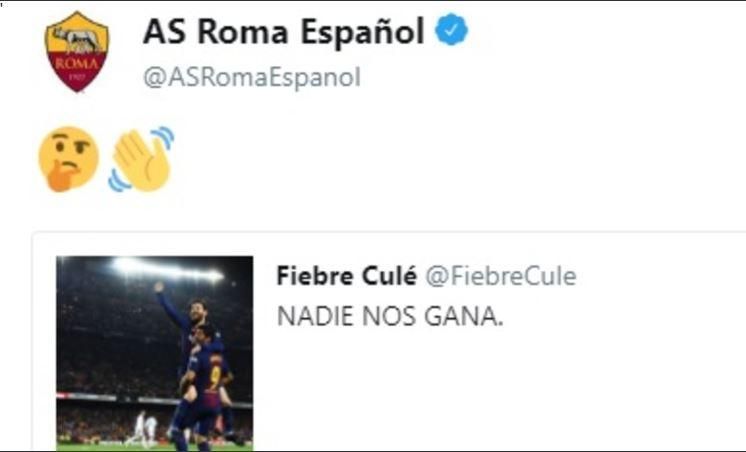 Il 2-2 nel Clasico ottenuto nonostante l'inferiorità numerica ha permesso al Barcellona di mantenere l'imbattibilità nella Liga. Sui social sono partiti i festeggiamente, ma il catalano "Fiebre Culé" ha commesso un piccolo atto di ingenuità. Su Twitter ha scritto "Nadie nos gana", letteralmente "nessuno ci batte". Pronta la risposta dell'account spagnolo della Roma che ha subito fatto partire la presa in giro in ricordo dell'eliminazione dalla Champions.