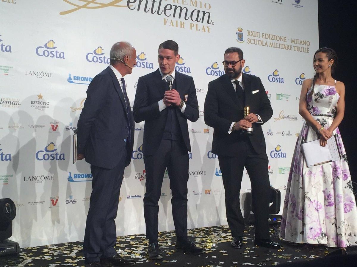 L'attaccante del Torino Andrea Belotti ha vinto la 23esima edizione del Premio Gentleman, al termine della cerimonia tenutasi alla Scuola Militare Teulié a Milano. Il granata succede nell'albo d'oro a Fabio Quagliarella e Giacomo Bonaventura, vincitori delle ultime due edizioni. "È un onore ricevere un premio del genere, la lealtà e il rispetto sono due fattori principali per noi sportivi perché ci deve essere il rispetto delle regole e degli avversari".L'attaccante del Torino Andrea Belotti ha vinto la 23esima edizione del Premio Gentleman, al termine della cerimonia tenutasi alla Scuola Militare Teulié a Milano. Il granata succede nell'albo d'oro a Fabio Quagliarella e Giacomo Bonaventura, vincitori delle ultime due edizioni. "È un onore ricevere un premio del genere, la lealtà e il rispetto sono due fattori principali per noi sportivi perché ci deve essere il rispetto delle regole e degli avversari".