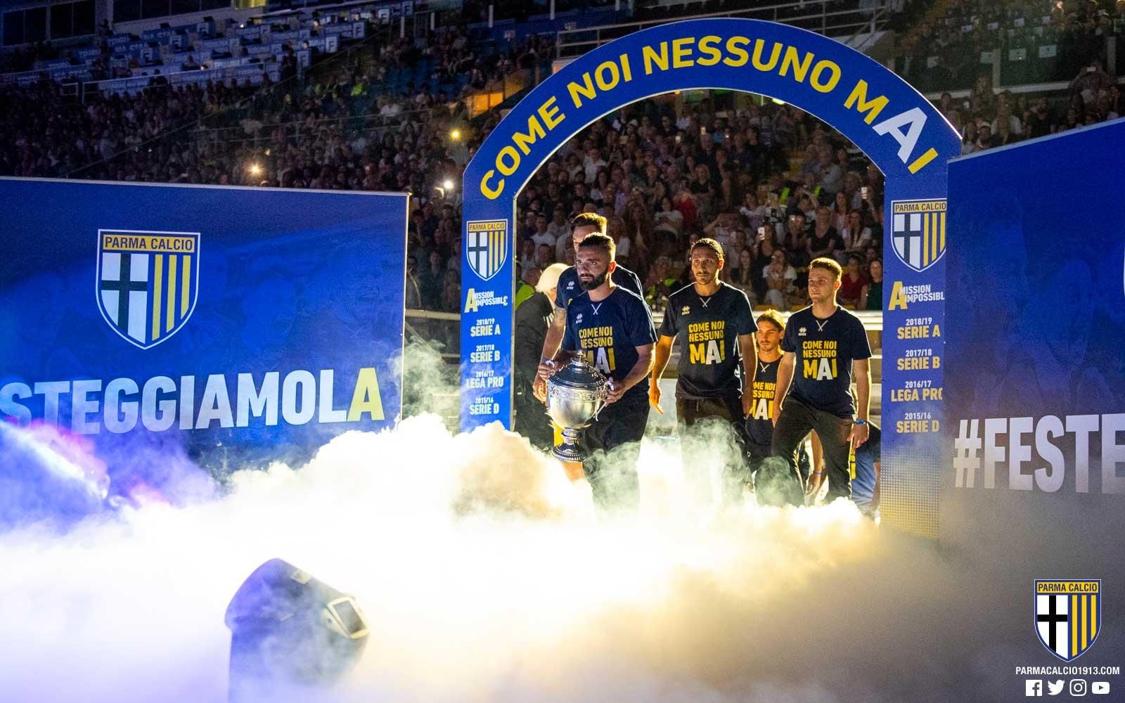 Notte di festa a Parma. I crociati hanno celebrato la promozione in A, la terza consecutiva, e hanno omaggiato Alessandro Lucarelli che ha deciso di lasciare il calcio. I gialloblù hanno deciso di ritirare la sua maglia numero 6.