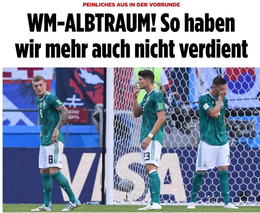 Perdendo 2-0 contro la Corea del Sud, la Germania campione del mondo in carica è stata eliminata al primo turno del Mondiale in Russia 2018. La notizia ha fatto il giro del mondo e i quotidiani sportivi non hanno lesinato critiche alla squadra di Loew, non solo in Germania. "La vergogna tedesca" si legge in patria, ma anche "la caduta dei tedeschi". In Inghilterra scherzano con un cubitale "Auf Wiedersehen" del Daily Mirror, mentre il Sun osa un "Nein, Nein, Nein".