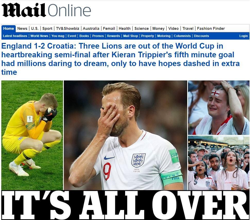 "The dream dies", "It's all over". Muore il sogno, è tutto finito. Così i titoli dei quotidiani inglesi on line dopo la sconfitta ai supplementari contro la Croazia nella semifinale mondiale e una finale che sfugge ancora. Distrutti e in lacrime i giocatori e i tifosi dei Tre Leoni. Più di 30 milioni di persone - scrive il Daily Mail - hanno seguito il match di stasera in tutto il Paese che aveva sognato al gol di Trippier dopo appena 5' di gioco. "E' tutto finito" anche per The Indipendent. "Il sogno inglese tramonta contro la Croazia" scrive il Guardian. "Ci avete reso orgogliosi" il titolo del Sun, che aggiunge: "La Croazia ha spezzato il cuore di un paese" che inseguiva la finale, 52 anni dopo il mondiale vinto in casa.