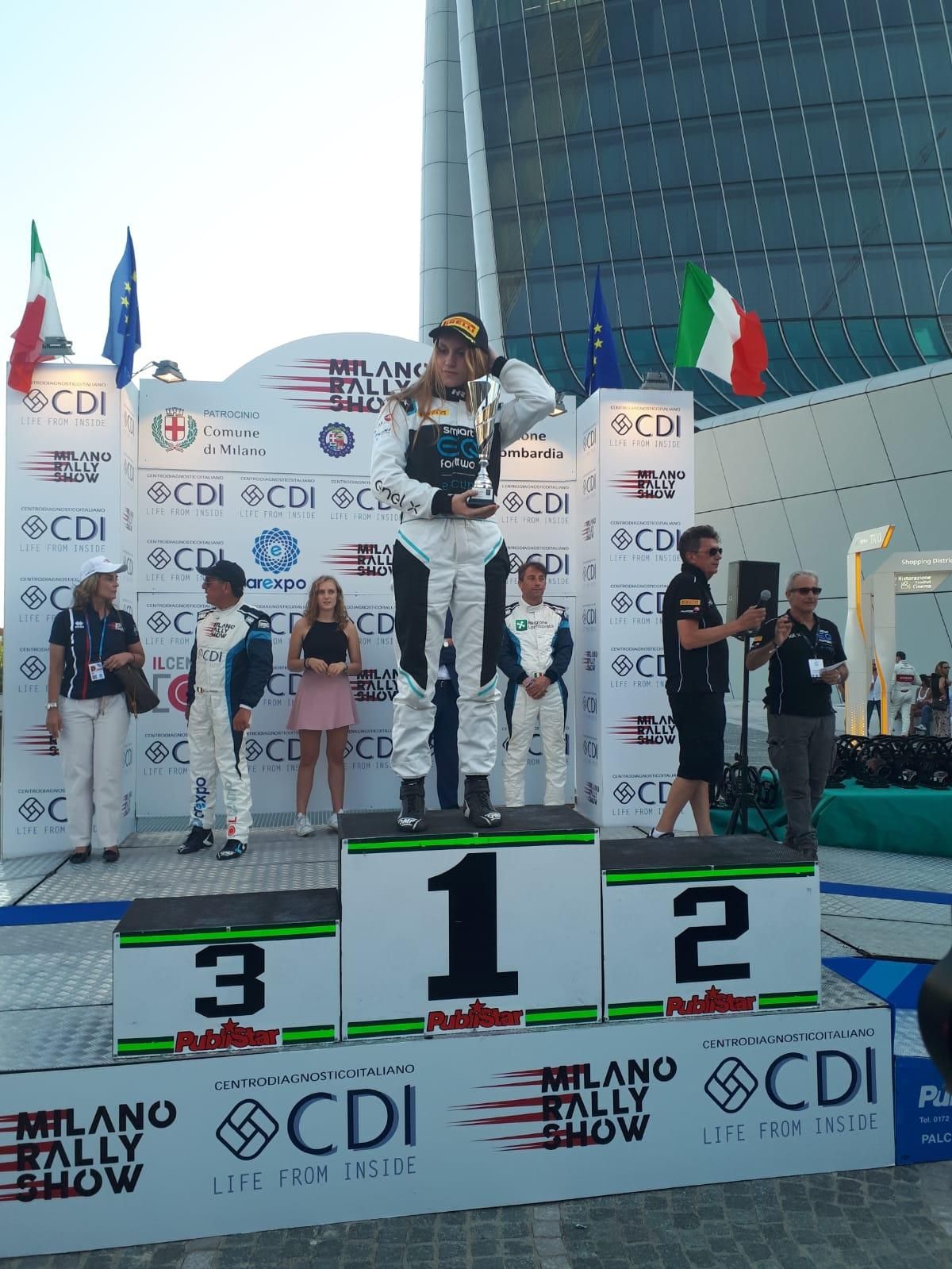 Premiati al Milano Rallt Show i vincitori della categoria smart EQ fortwo e-cup:Giuseppe Bodega e Marco Panzavuota (LPD), vincitori con 2"1 di vantaggio su Alberto Lembo e Antonio Massimiliano d’Amico. Terzi sul podio sono Piergiorgio Capra e Sofia Cardarelli (concessionaria Mercedes-Benz Venus). Premiati anche i vincitori di categoria: Lembo per la categoria Senior, Simoni per la categoria Junior e la coppia Somaschini-Boero per la categoria Lady.