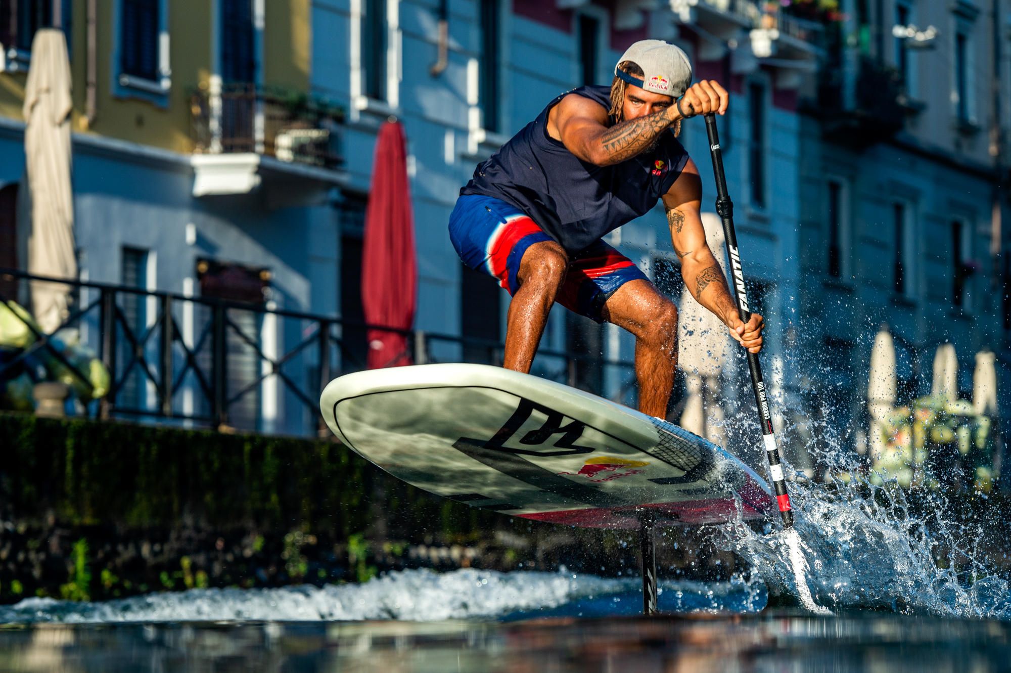 Sveglia presto, città completamente deserta e il Naviglio a portata di mano: questi gli elementi che hanno permesso ad Airton Cozzolino di regalare a Milano una performance del tutto inedita. Messa in acqua la sua tavola - dotata di una particolare pinna da foil- Airton ha letteralmente volato sull’acqua, percorrendo il lungo Naviglio Pavese, fino alla Darsena. Il foil è una nuova disciplina che, grazie all’utilizzo di una particolare “pinnetta”, permette alla tavola di alzarsi sull’acqua, dando l’impressione di volare. Principalmente praticato al mare - per la pressione generata dal sale- questo sport non necessita di onde o di vento e rende possibile a chiunque, dopo molto allenamento, di planare sulle superfici d’acqua. Un modo divertente e fuori dagli schemi per visitare Milano e vincere il torrido caldo di agosto. (foto Olaf Pignataro/Red Bull Content Pool)