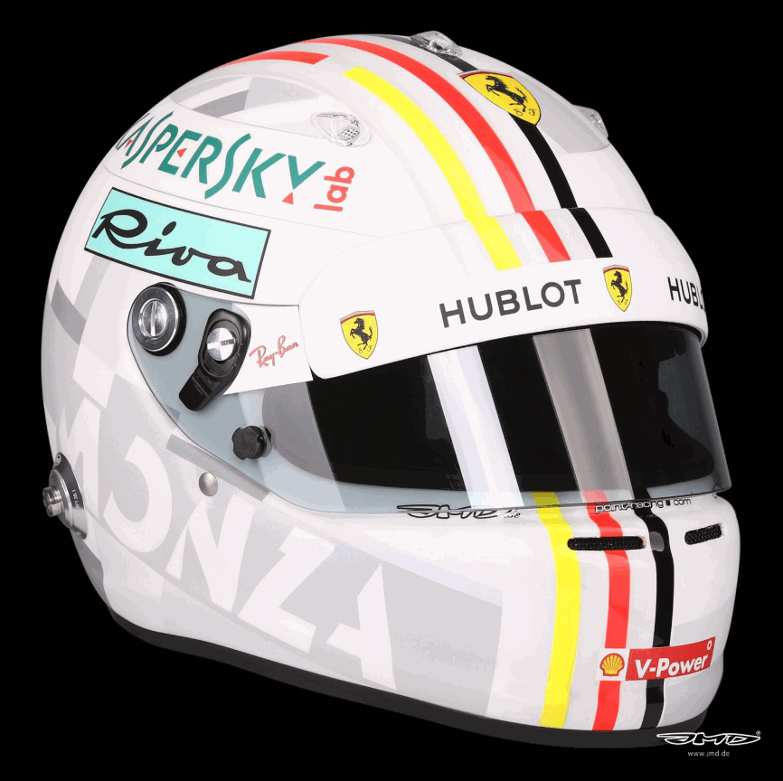 Livrea dedicata al GP d'Italia per il pilota Ferrari: sul casco di Seb le scritte "Monza" e "Five" (il suo numero di macchina, oltreché il numero di titoli iridati a cui ambisce in questa stagione). Il font è quello che veniva utilizzato nei poster pubblciitari degli anni '50, quando si correvano le prime edizioni del Gran Premio. La scritta "Monza" sul lato destro del casco evoca un dolce ricordo per Seb: nel 2010 infatti, prima del via del GP di Abu Dhabi che chiuse la stagione, il suo ingegnere di pista Rocquelin scrisse con un pennarello "Monza" sul lato destro della balaclava del pilota, in ricordo della sua prima vittoria in assoluto (proprio in Italia, nel 2008). Seb si laureò campione del mondo per la prima volta al termine di quel GP, portando Monza in testa.