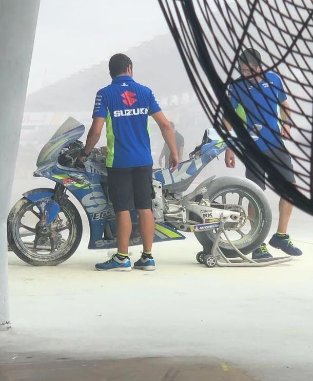 Non è iniziato nel migliore dei modi in fine settimana di Sepang per Alex Rins. La sua Suzuki numero 42, infatti, ha preso fuoco mentre si trovava in corsia box per la classica fase di riscaldamento del motore. Probabilmente della benzina è finita sullo scarico, inciendiandosi e avvolgendo la GSX RR. Attimi di paura, ma per fortuna nessun danno ai meccanici. Qualcuno in più per la moto...