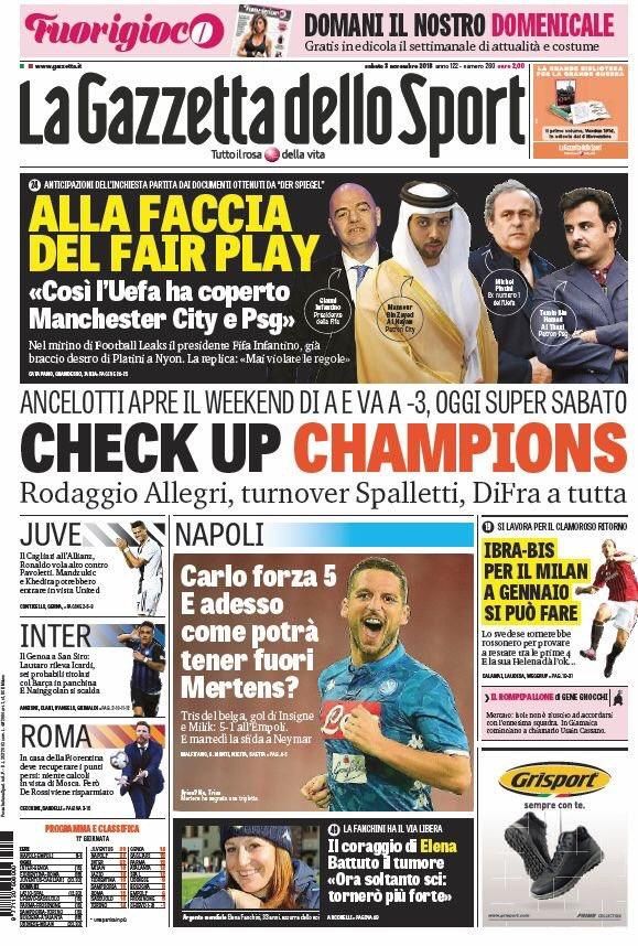Ecco le prime pagine e gli approfondimenti sportivi dei principali quotidiani italiani e stranieri in edicola oggi, sabato 3 novembre 2018.