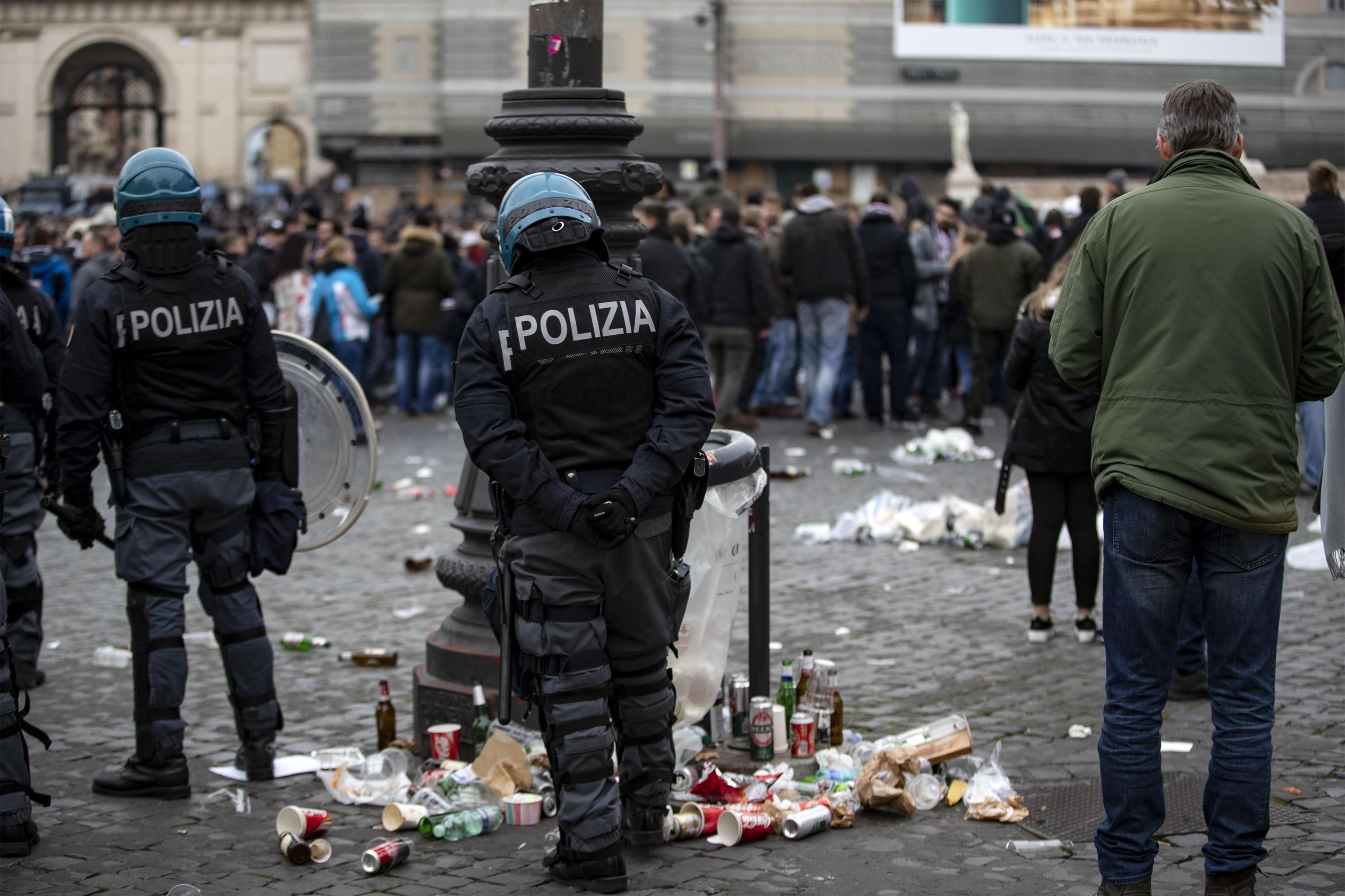 Massima allerta a Roma in vista di Lazio-Eintracht Francoforte: come in Germania due mesi fa, tensione tra tifosi tedeschi (ne sono attesi novemila all'Olimpico) ed italiani alla vigilia del match di ritorno di Europa League. Cinque tedeschi sono stati fermati dopo lanci di bombe carta e tafferugli in piazzale Flaminio, altri sono stati bloccati bloccati sul Ponte della Musica mentre provavano a raggiungere il ponte Duca d'Aosta.