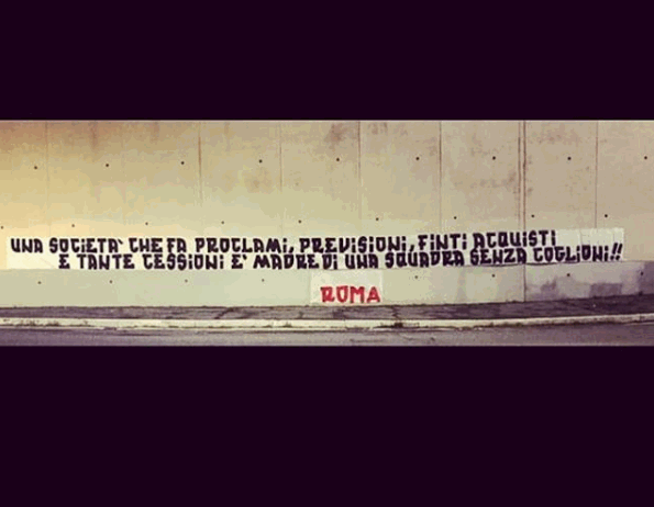 Svariate decine, si stima siano sulla cinquantina, di striscioni sono stati piazzati nella notte per tutta Roma: il destinatario è James Pallotta mentre i tifosi giallorossi ne sono gli autori. Continua dunque la contestazione contro il presidente della Roma, chiamato a lasciare la società "Vattene", "Vogliamo il tuo funerale", "Mai stati uniti". Un altro striscione contro Pallotta era stato esposto durante la sfida contro il Viktoria Plzen. (foto forzaroma.info e laroma24.it)