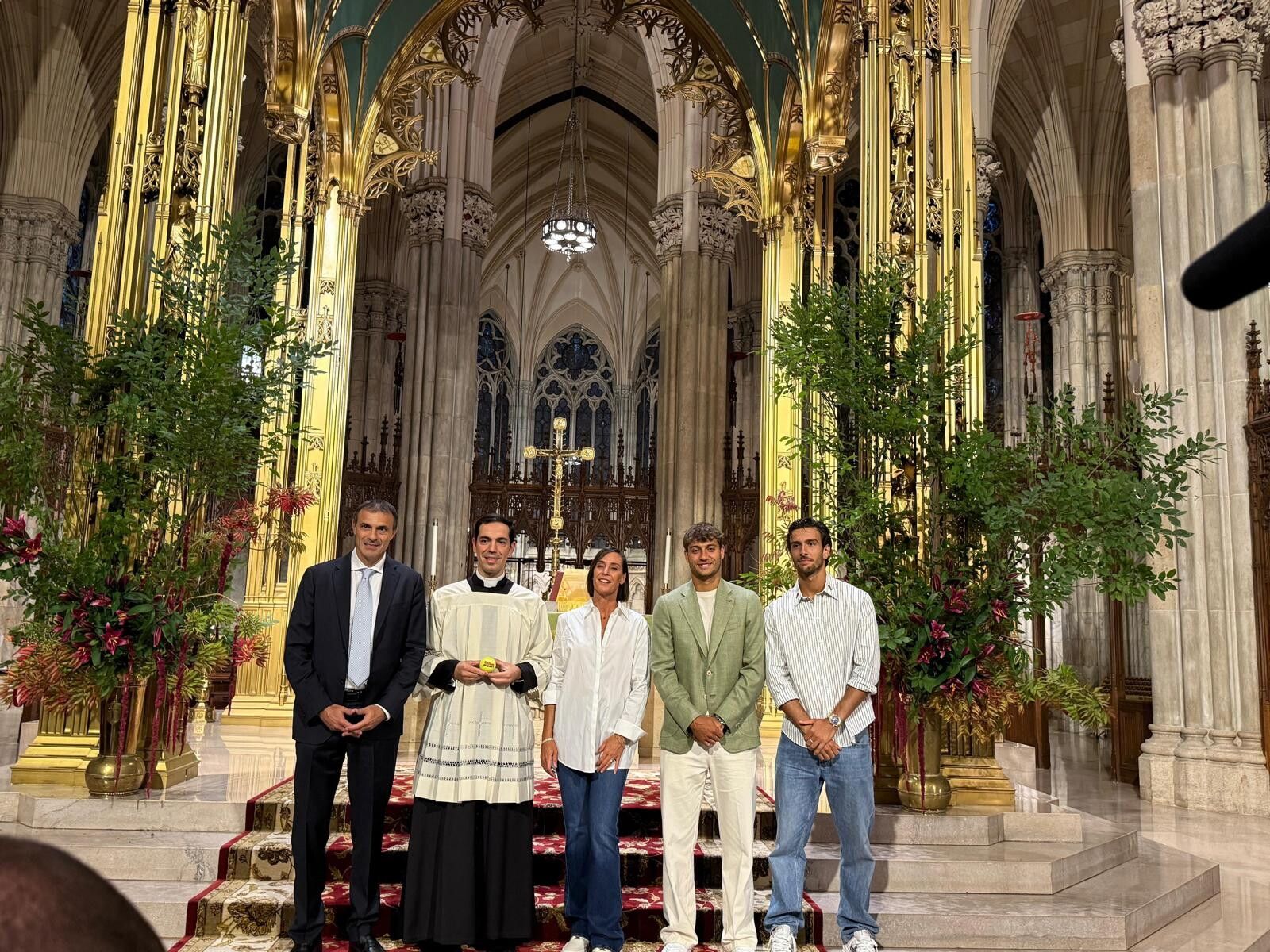 Ieri momento emozionante e spirituale a New York per diversi tennisti che stanno preparandosi agli Us Open 2025: Lorenzo Musetti, Flavio Cobolli e (nella giornata di giovedì) Carlos Alcaraz, tra gli altri, sono stati accolti e benedetti da don Luigi Portarulo, prete della comunità italiana a NY, nella chiesa di St Patrick's. Presente anche Flavia Pennetta, vincitrice del torneo americano nel 2015.