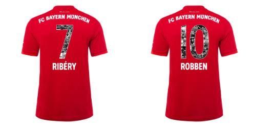 Il Bayern Monaco si prepara a dire addio a due leggende del club, Franck Ribery e Arjen Robben, che lasceranno la Baviera dopo un decennio di trionfi. Per l'occasione il club tedesco ha messo in vendita due magliette celebrative. La novità sta all'interno dei numeri 7 e 10, quelli indossati in questi anni dal francese e dall'olandese: al posto del classico colore bianco, un collage di foto con le esultanze dei due campioni.
