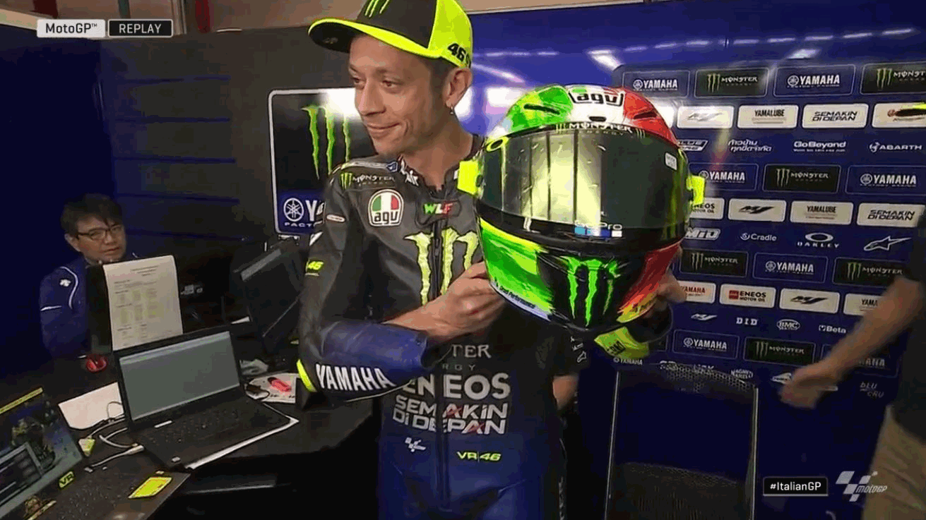 Come da tradizione, casco speciale disegnato da Aldo Drudi per Valentino Rossi in occasione del GP d'Italia. Il pilota Yamaha ha optato per una soluzione "artistica", con un tricolore simile a quello esibito nel 2018, ma "pennellato", senza fumetti o gag particolari.