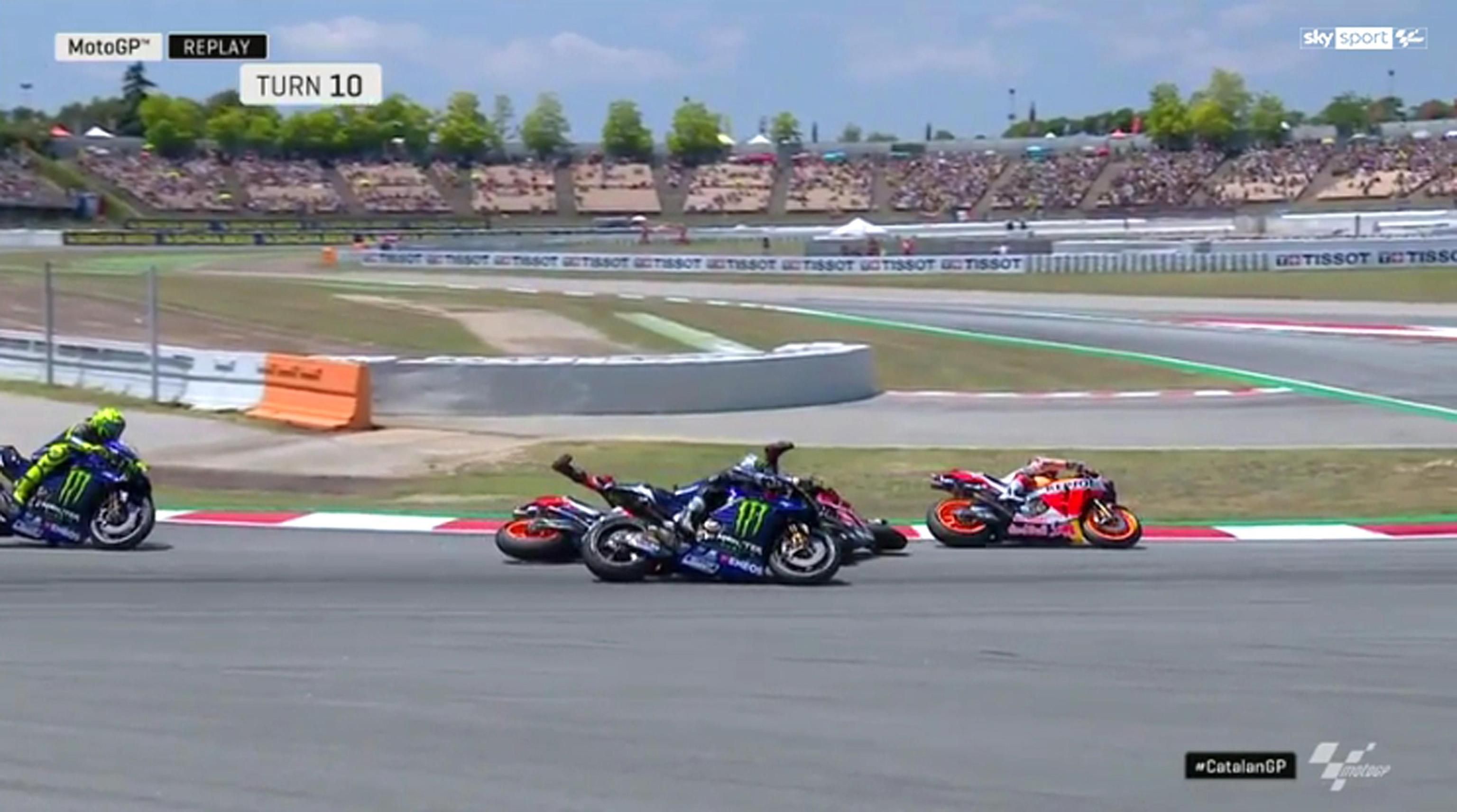 Clamoroso a Barcellona. Lo spettacolo di una gara che poteva essere combattutissima è stato di fatto cancellato dopo pochi giri, quando Jorge Lorenzo ha perso l'anteriore della sua Honda, scivolando alla curva 10 e stendendo anche Dovizioso, Vinales e Valentino Rossi. Troppa foga nell'ingresso per il maiorchino, che ha rovinato la domenica dei rivali. Alla fine è stato lo stesso pilota Honda a prendersi ogni responsabilità.