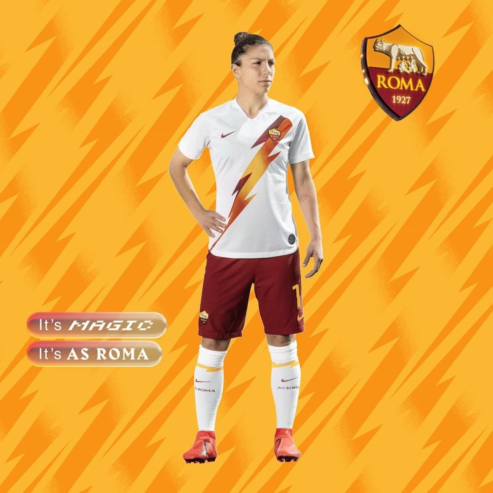 La divisa Away 2019-20 della Roma è illuminata da un fulmine che corre lungo la parte frontale della maglia, elemento che già caratterizza la divisa Home. Anche nella divisa Away il design si ispira alla mitologia romana e in particolare a Giove, il “Re degli Dei” secondo gli antichi romani, ma qui il fulmine è predominante: la saetta attraversa il petto dalla spalla sinistra al fianco destro verso la parte bassa della maglia bianca, con bordi caratterizzati da vivaci sfumature rosse e arancioni. La divisa è completata da pantaloncini rossi e calzettoni bianchi con un fulmine giallo, lo Swoosh Nike e la scritta “‘AS Roma” rivolta verso l’alto a metà tibia. Pete Hoppins, Apparel Senior Design Director di Nike Football, ha poi aggiunto: “Quando si mettono insieme colori della AS Roma e il grande retaggio mitologico della città, si ottiene un mix potentissimo. Il tema del fulmine è un concept molto forte per la stagione 2019-20 e penso che sia la divisa Home sia quella Away offrano un fresco tocco di novità, pur restando fedeli all’identità del club".