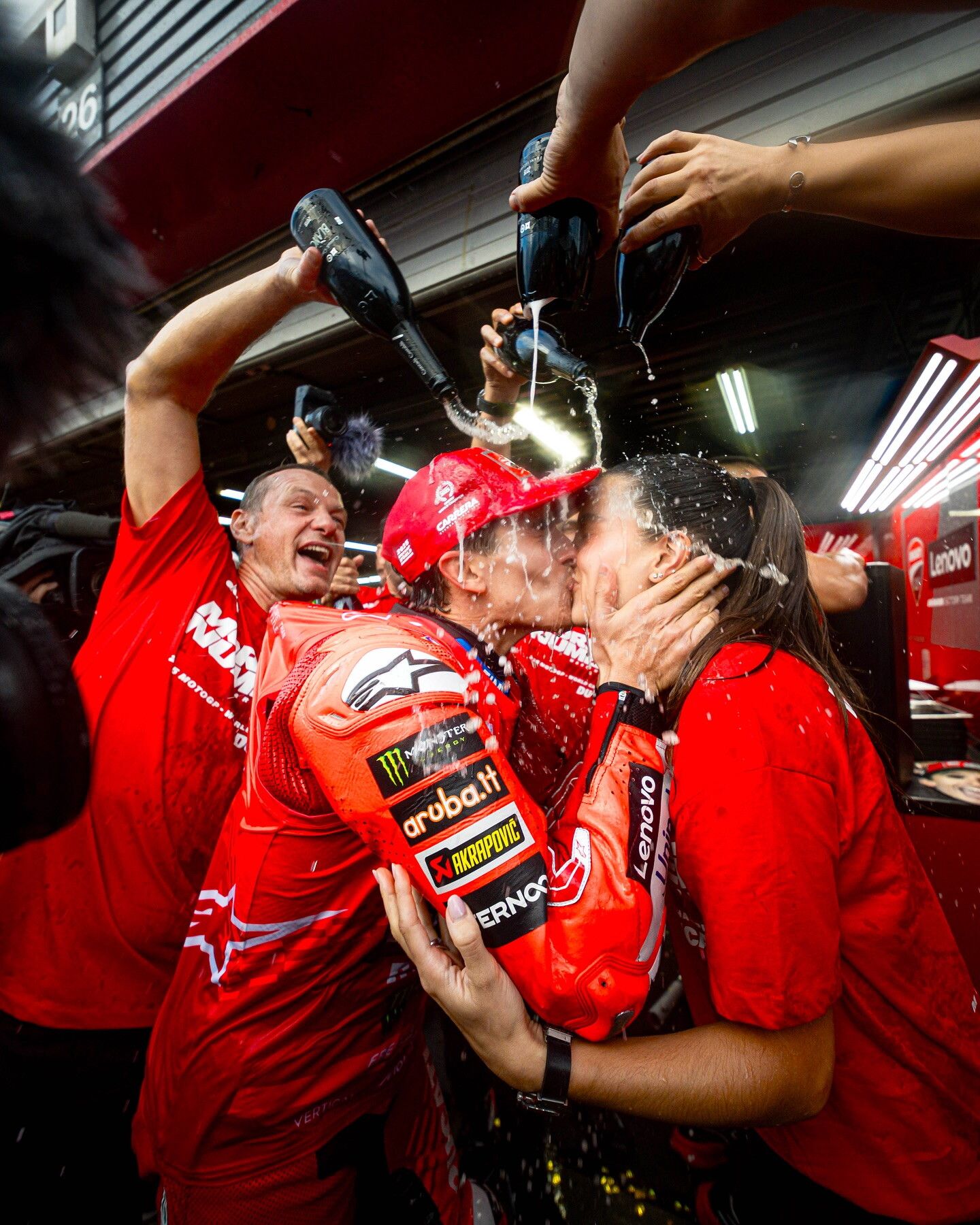 Marc Marquez ha vinto il nono titolo mondiale in carriera e la festa ai box Ducati si è arricchita di Gemma Pinto: la fidanzata dello spagnolo lo ha premiato con un bacio, diventato virale anche sui social.
