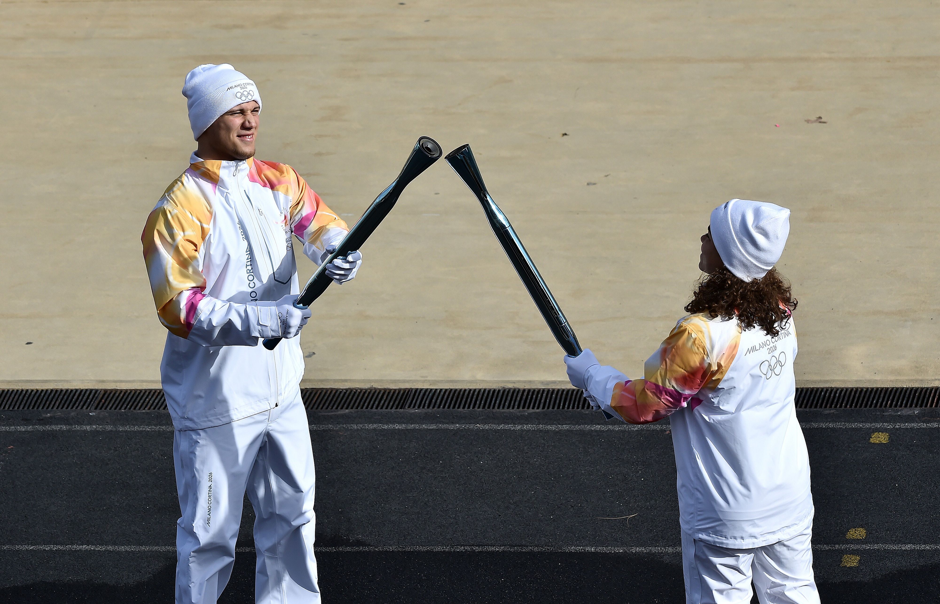 Dalla fiamma del braciere olimpico, la 'grande sacerdotessa', interpretata dall'attrice greca Mary Mina, ha acceso l'ultima torcia e l'ha consegnata al presidente del Comitato olimpico ellenico, Isidoros Kouvelos. Dalle sue mani la fiamme è passata, tra gli applausi, in quella del presidente della Fondazione Milano-Cortina 2026, Giovanni Malagò. La fiamma è stata poi custodita in una lanterna ad olio, dove viaggerà, a bordo di un volo di Ita Airways, per atterrare oggi alle 17 nell'areoporto di Fiumicino a Roma.