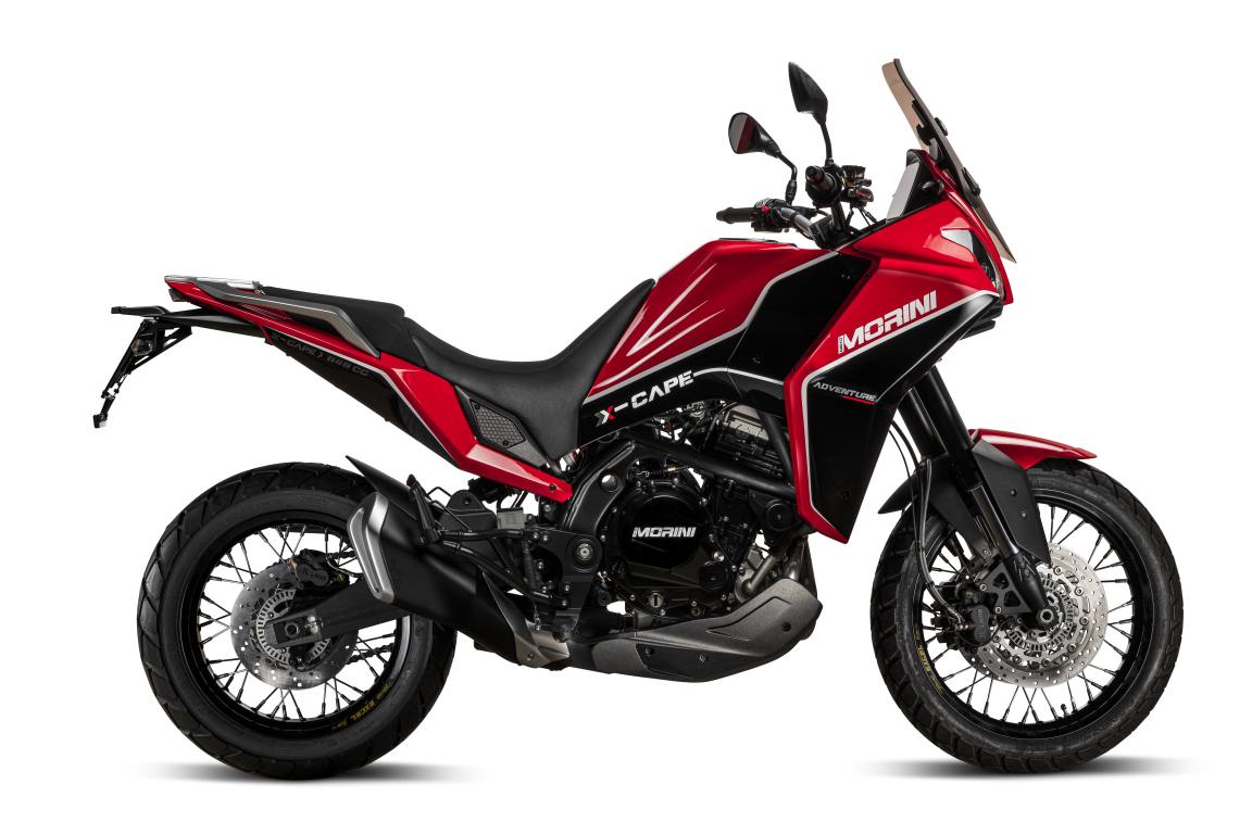 X-CAPE è la nuova Adventure firmata Moto Morini: versatilità, divertimento e comfort distillati in una linea futuristica e accattivante.La ruota anteriore da 19’’ e la forcella regolabile da ben 50 mm di diametro, garantiscono una tenuta di strada sorprendente, rendendola adatta ai passi di montagna così come ai sentieri sterrati.La sella dalle dimensioni generose, comoda anche per il passeggero, è posizionata a soli 83 cm da terra, ma offre un’ergonomia perfetta anche per i più alti.Lo schermo TFT a colori di ben 7’’ – fra i più grandi dell’intero mercato – dà accesso ad una panoramica completa e chiara su tutte le informazioni necessarie ai viaggi più avventurosi, così come nel caotico traffico cittadino.Il parabrezza regolabile con una sola mano, il portapacchi con ampi maniglioni per il passeggero e i fari full led completano la dotazione di serie da classe decisamente superiore. Non mancheranno accessori fondamentali come il tris di borse, le barre protettive e le manopole riscaldabili, indispensabili su una vera Adventure.La moto verrà commercializzata in versione standard o limitata a 48 cv, forniti da un motore di grande affidabilità e dall’erogazione facile e divertente, perfetto per tutti coloro che sono alla ricerca di una compagna fedele ed instancabile.