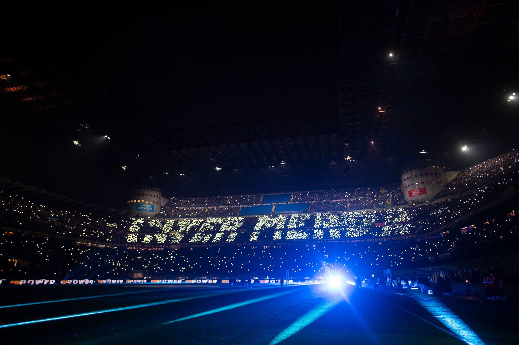 Derby in campo, derby sugli spalti. I tifosi del Milan hanno anticipato la coreografia sfruttando l'idea dei colleghi laziali: gli smartphone usati per creare una scritta offensiva "Inter me**a". Poi si passa alla sfida dei cugini "Vuoi fare l'ultrà poi... interista zabetta (chiacchierone in milanese, ndr)". La Curva Nord invece a cavallo sul biscione rossonero.