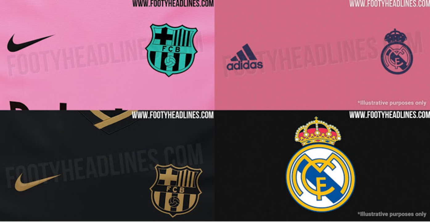 Il solito Footyheadlines ha rilasciato importanti leak per le divise di Barcellona e Real Madrid della prossima stagione, in particolare la seconda e la terza maglia. La curiosità è che entrambe useranno basi nere o rosa: i blaugrana nero/oro per il kit da trasferta e il rosa per la terza divisa, le merengues rosa fuori casa e nero per la terza maglia.