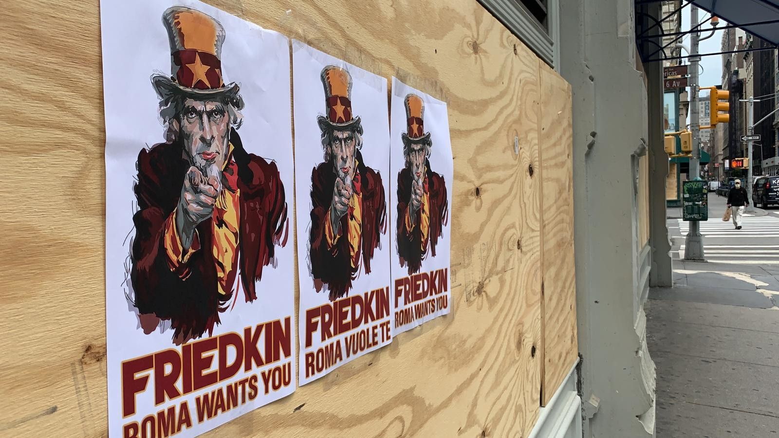 Ieri a Manhattan, distretto di New York, sono spuntati diversi volantini dei tifosi giallorossi che chiedono il passaggio di mano della Roma da Pallotta a Friedkin. "Roma wants you, Roma ti vuole" il messaggio rivolto a Friedkin. L'immagine che prende spunto dai volantini della prima e seconda guerra mondiale in cui gli Usa cercavano di reclutare soldati.