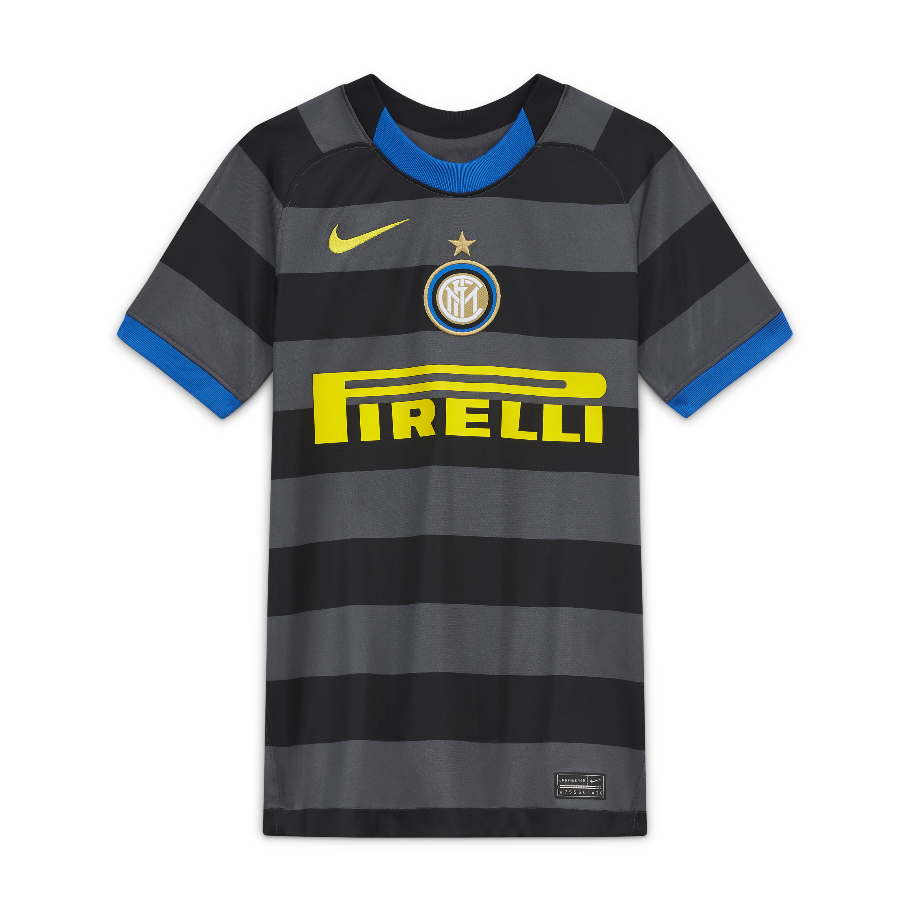 L'Inter ha presentato la nuova terza maglia per la stagione 2020/21, caratterizzata da un design dalle strisce orizzontali di colore nero e grigio scuro. Il kit, che sarà indossato nei match delle competizioni europee, celebra la ‘jersey culture’ degli anni Novanta. La maglia presenta strisce nere e grigio scuro e riporta il logo dell’Inter al centro e dettagli gialli. La forma del colletto e la finitura blu dello scollo e delle maniche incorniciano perfettamente la maglia. Pantaloncini e calzettoni neri completano il look che ricorda molto quello con cui l'Inter nel 1997-98 vinse con Ronaldo la Coppa Uefa.