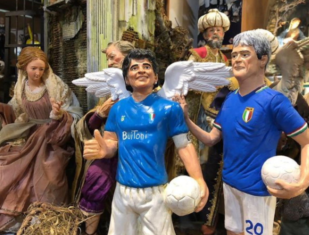 Due grandi campioni del calcio sono scomparsi a pochi giorni di distanza uno dall'altro: Diego Armando Maradona e Paolo Rossi rivivono nelle statuette di Genny Di Virgilio, artista di San Gregorio Armeno celebre per la realizzazione di figure importanti, sportive e non, che poi finiscono nel classico presepe (foto NapoliMagazine.com).