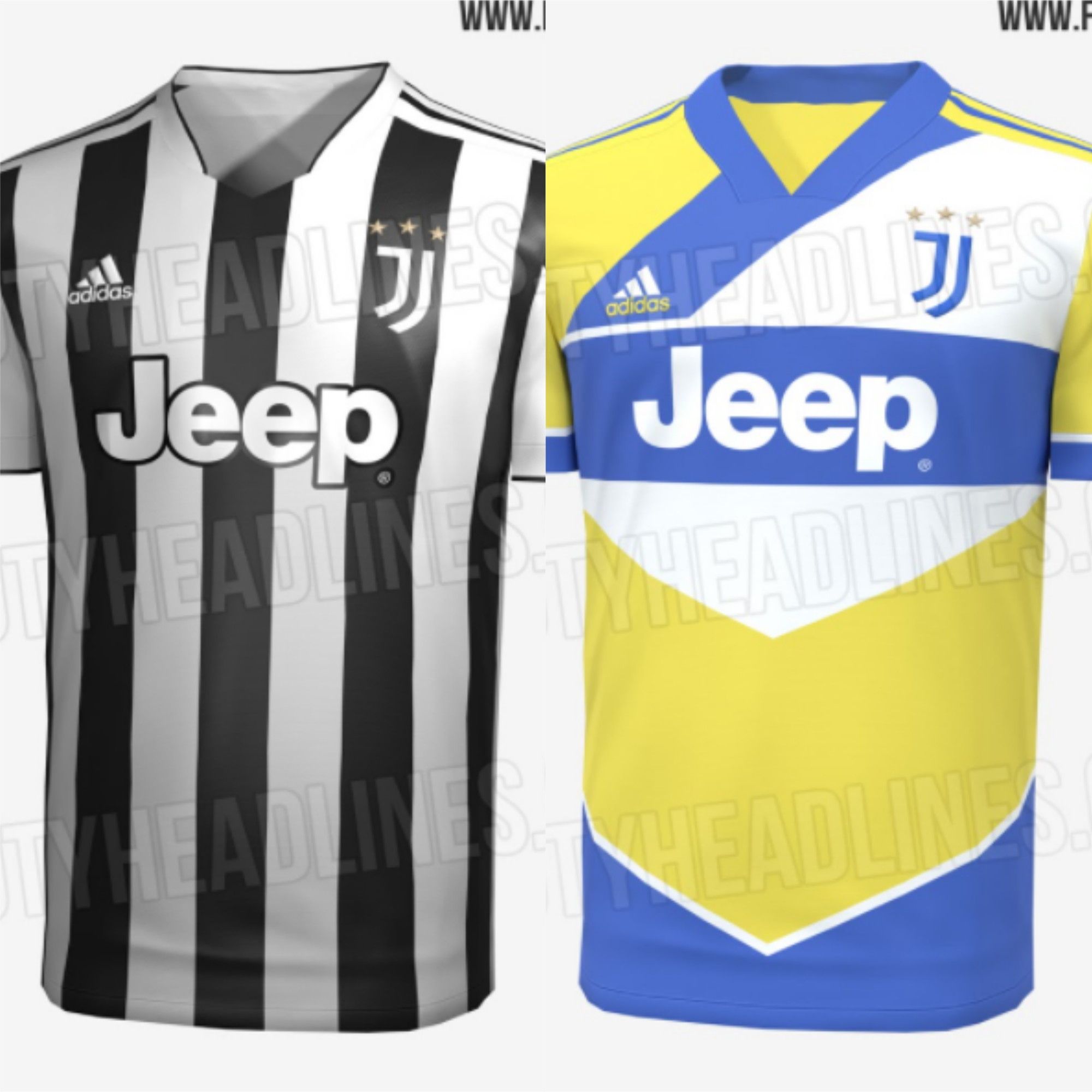 FootyHeadlines ha svelato le immagini della prima e della terza maglia della Juventus per la prossima stagione, la 2021/22. Se la prima divisa gioca sul classico bianconero, la particolarità starà in un dettaglio che ricorderà il decimo anniversario dello Stadium: una patch con la grafica "10 years at home", dieci anni a casa. Decisamente più innovativa la terza maglia con il giallo (denominato shock) e il blu a farla da padrone assieme al bianco, uniti da uno stile geometrico.