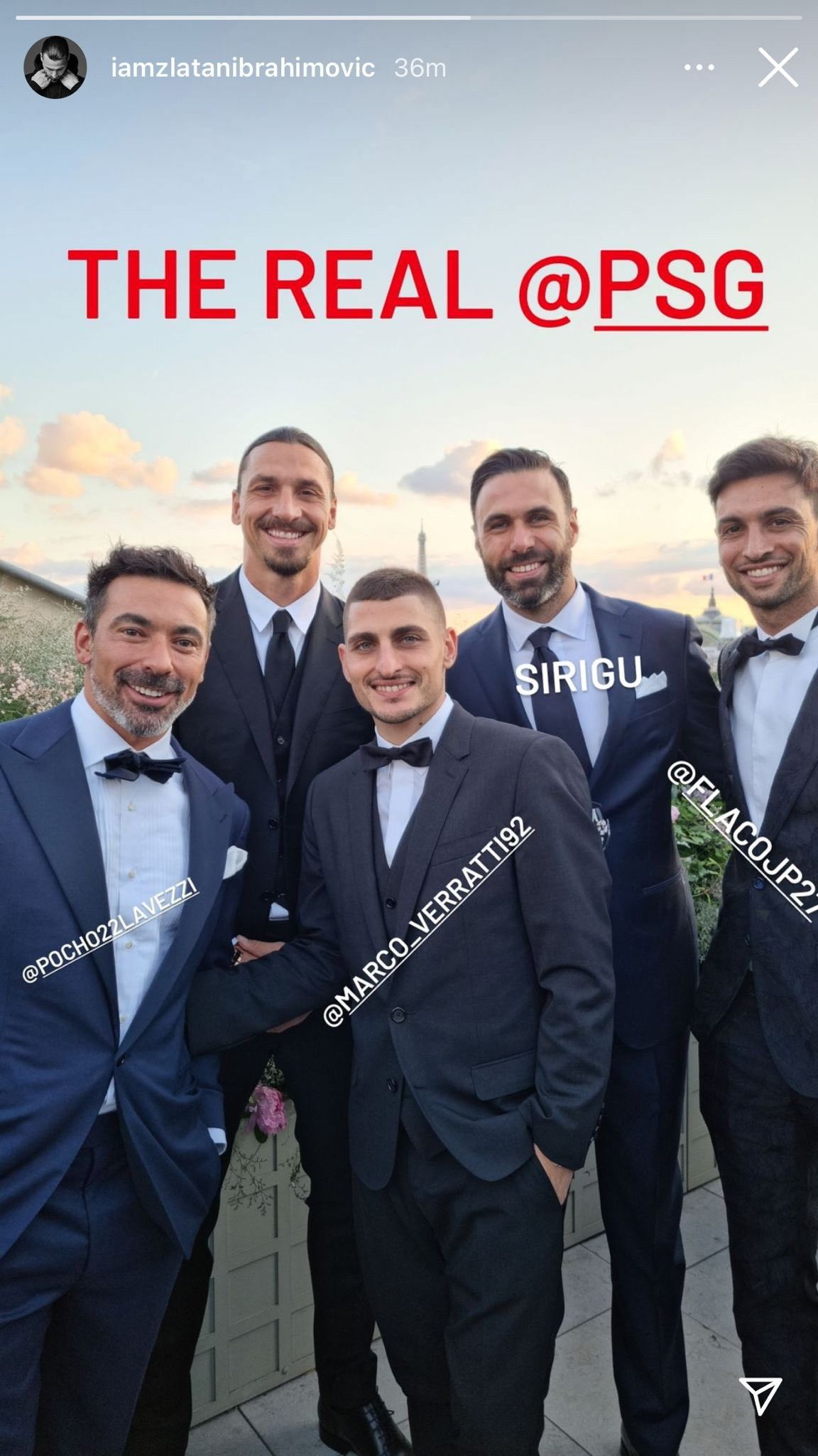 Marco Verratti ha detto sì alla consorte Jessica Aidi e alle nozze a Parigi erano presenti anche tanti ex del PSG come Javier Pastore, Ezequiel Lavezzi, l’altro fresco campione d’Europa Salvatore Sirigu e anche Zlatan Ibrahimovic. Proprio lo svedese del Milan ha postato su Instagram una foto con gli ex compagni e ha scritto: “Il vero PSG”.