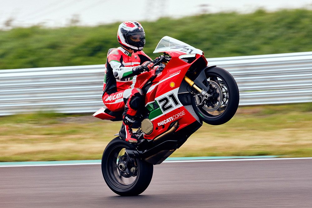 Il 21 è un numero magico per Ducati da quando Troy Bayliss lo ha scolpito con le sue vittorie nella storia del motociclismo. Proprio nel 2021, a vent’anni dalla conquista del Campionato Mondiale Superbike 2001, Ducati omaggia la leggendaria carriera del pilota australiano dedicandogli una moto speciale, prodotta in serie numerata, che celebra il primo dei tre titoli WorldSBK vinti da Bayliss: nasce così la Ducati Panigale V2 Bayliss 1st Championship 20th Anniversary. Realizzata partendo dalla base della Panigale V2, la versione “Bayliss 1st Championship 20th Anniversary” si caratterizza per la speciale livrea , la cui grafica si ispira a quella della 996 R che nella stagione 2001 ha accompagnato Bayliss alla conquista del suo primo titolo mondiale, rivisitandone colori e tagli. Il rosso Ducati è il colore principale della moto e si unisce al verde e al bianco in un tributo all’italianità della Casa motociclistica bolognese, mentre sui lati e sul frontale spiccano l'iconico n°21, numero di gara di Troy Bayliss, e il logo Shell, che rafforzano visivamente il legame con la moto da corsa. Sul serbatoio è riprodotto l’autografo di Troy, mentre sulla piastra di sterzo in alluminio ricavata dal pieno sono riportati il nome della moto e la numerazione progressiva di questo modello unico. Per rendere la moto ancora più efficace nella guida in pista, Ducati ha scelto di dotare la Panigale V2 Bayliss 1st Championship 20th Anniversary della componentistica Öhlins . La forcella NX30 e l’ammortizzatore posteriore TTX36 garantiscono massima scorrevolezza e sono progettati per ottenere le migliori prestazioni in circuito, con un assetto che rende la moto più precisa e offre al pilota un maggior feeling e un maggior supporto in tutte le fasi di guida. L’ammortizzatore di sterzo, grazie alle regolazioni di cui è dotato, permette di personalizzarne la taratura adattandola allo stile di guida e alle caratteristiche del tracciato. Rispetto alla versione standard, la Panigale V2 Bayliss 1st Championship 20th Anniversary è anche più leggera di 3 kg, grazie all’adozione della batteria agli ioni di litio e alla scelta della configurazione monoposto che richiama esplicitamente il look della moto da gara (sella passeggero e pedane sono disponibili nell’equipaggiamento a corredo). L’equipaggiamento è completato dalle manopole sportive, dalla cover del finale del silenziatore in fibra di carbonio e titanio e dalla sella pilota realizzata abbinando due diversi materiali tecnici con doppia cucitura rossa. Sulla sella è ricamato il numero 21 di Troy in bianco affiancato da due bande verticali di colore verde e rosso a comporre la bandiera italiana. La moto monta inoltre le pompe freno e frizione autospurganti con serbatoi olio in colorazione fumè. La Panigale V2 è la super-mid delle sportive Ducati e rappresenta il modello d’ingresso alla famiglia Panigale. È spinta dal bicilindrico Superquadro da 955 cm³ (conforme alla normativa Euro 5), con una potenza massima di 155 CV a 10.750 giri/minuto e una coppia massima di 104 Nm a 9.000 giri/minuto. La ciclistica è basata sul telaio monoscocca, mentre il design elegante e sportivo si ispira a quello della Panigale V4. Il pacchetto elettronico, dedicato alla sicurezza attiva e al controllo della dinamica del veicolo, prevede la funzionalità "cornering" applicata all’ABS Bosch, il cambio elettronico con funzionamento anche in scalata e i controlli di trazione, freno motore e impennata (Ducati Quick Shift, Ducati Traction Control, Ducati Wheelie Control, Engine Brake Control). Tutti i controlli sono integrati nei tre Riding Mode (Race, Sport e Street) modificabili tramite il cruscotto TFT a colori da 4,3" con grafica e interfaccia studiate per rendere intuitiva la navigazione del menù e la regolazione dei settaggi, oltre che l’immediata identificazione del Riding Mode selezionato. La Panigale V2 Bayliss 1st Championship 20th Anniversary sarà disponibile nei concessionari della rete Ducati a partire da fine settembre 2021 al prezzo di 20.990 € franco concessionario (prezzo riferito al mercato italiano).