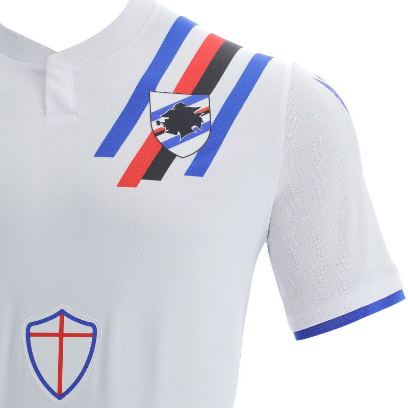La seconda maglia è bianca con collo alla coreana in maglieria e con chiusura a tre bottoni ed è caratterizzata da una banda diagonale formata da righe con i tradizionali colori del club blucerchiato: blu royal, bianco, rosso, nero e ancora bianco e blu. La banda, da sinistra a destra, non è però continua, si spezza al centro dove è presente la patch con la croce di San Giorgio, simbolo del capoluogo ligure e sempre presente all’interno della fascia blucerchiata nelle maglie dell’U.C.Sampdoria.Il backneck è personalizzato con la banda blucerchiata e la scritta La Maglia Più Bella Del Mondo. Nel retrocollo esterno è stampato in blu il profilo del “Baciccia”, tipico pescatore genovese con barba con caratteristico berretto e pipa, simbolo della squadra. Sul petto, a destra, in stampa siliconata e in blu, il Macron Hero, logo del brand italiano; a sinistra, lato cuore, sempre in silicone, la patch con lo stemma U.C.Sampdoria che si sovrappone alla banda diagonale.Il kit ‘Away’ è completato da pantaloncini blu royal con coulisse dell’identico colore e puntali bianchi, i bordi coscia hanno una banda bianca e dettaglio blucerchiato. I calzettoni sono blu royal con al centro le quattro bande colorate: bianca, rossa, nera e ancora bianca. Davanti il Macron Hero; dietro, sul polpaccio, la scritta U.C.Sampdoria.