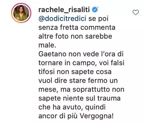 Gaetano Castrovilli non ha ancora superato il suo infortunio al costato e la Fiorentina lo aspetta. Un tifoso viola ha commentato una foto del centrocampista pubblicata dalla compagna Rachele Risaliti, scatenando la rabbia della donna: "Se poi senza fretta ci fa la cortesia di tornare anche a giocare non sarebbe male eh", ha scritto il tifoso e la risposta di Lady Castrovilli non si è fatta attendere: "Se poi senza fretta commenta altre foto non sarebbe male. Gaetano non vede l’ora di tornare in campo, voi falsi tifosi non sapete cosa vuol dire stare fermo un mese, ma soprattutto non sapete niente sul trauma che ha avuto, quindi ancor di più Vergogna!".