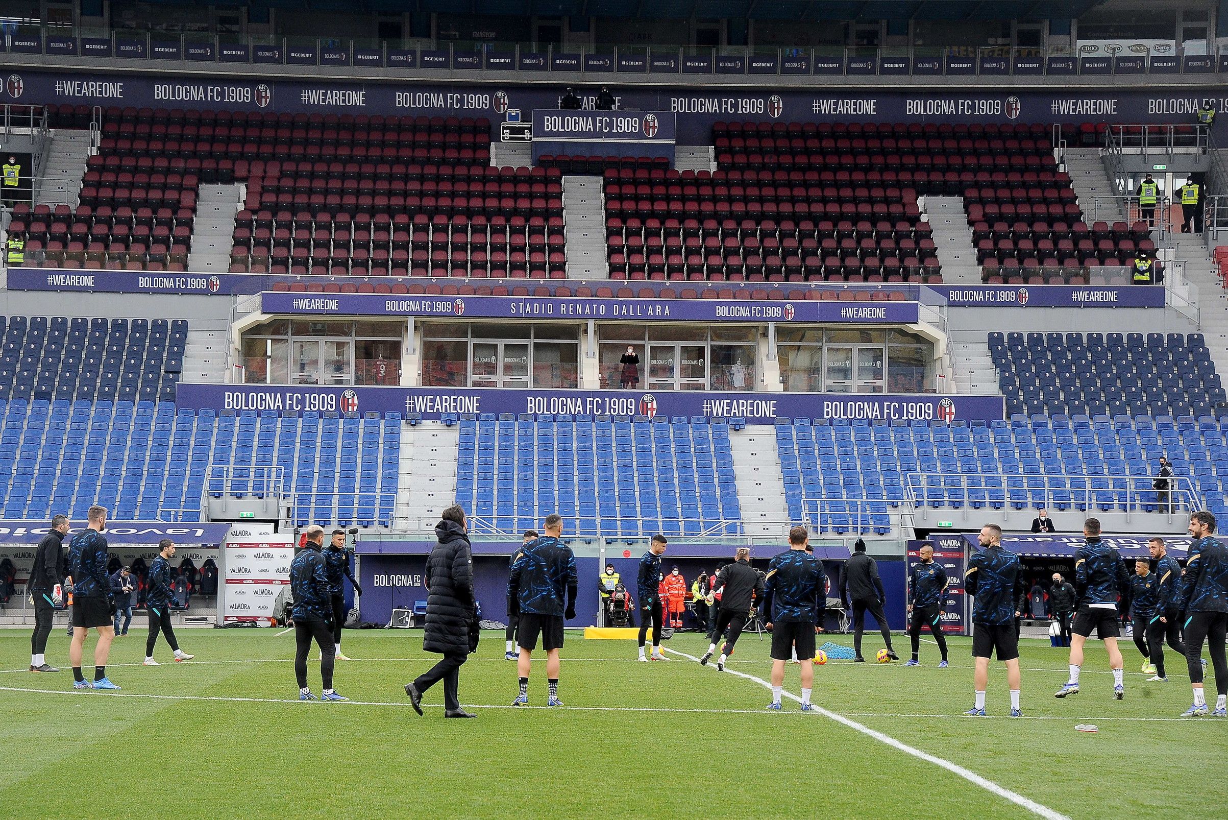 I nerazzurri, insieme agli arbitri, si sono presentati sul terreno di gioco del Dall'Ara, ma la partita con il Bologna non si giocherà perché i giocatori rossoblù sono in quarantena. Solo allenamento per gli uomini di Simone Inzaghi.