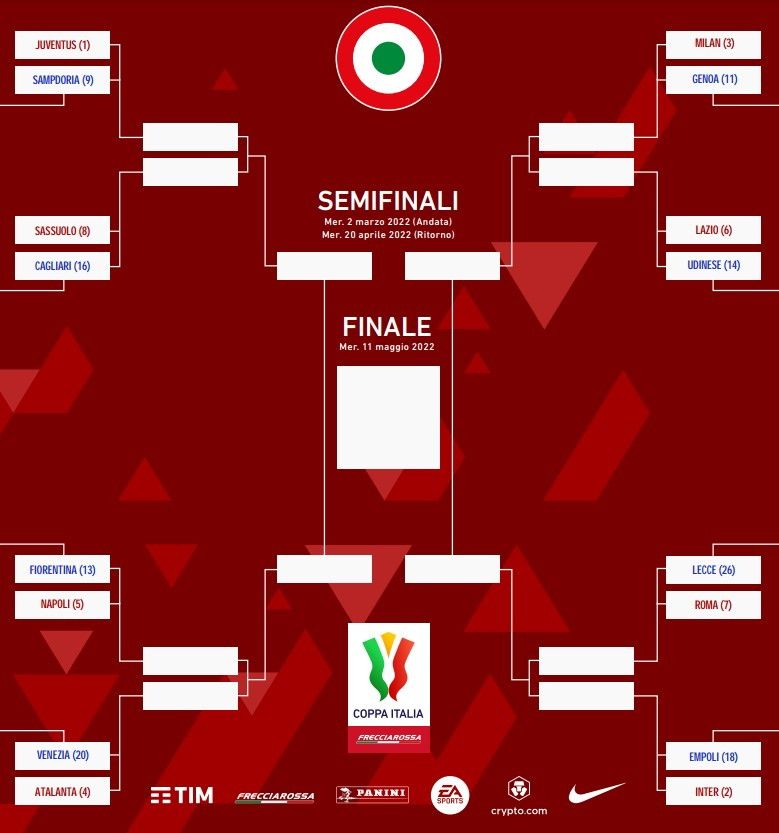 La Coppa Italia entra nel vivo con le gare degli ottavi di finale, che verranno disputate dal 12 al 20 gennaio e saranno trasmesse in esclusiva in chiaro sulle reti Mediaset e in live streaming su Sportmediaset.it e Mediaset Infinity. Le otto squadre che andranno avanti dovranno scendere in campo nei quarti, tutti in programma il 9 febbraio. Le semifinali di andata verranno disputate mercoledì 2 marzo, mentre quelle di ritorno mercoledì 20 aprile. La finale, invece, è in programma per mercoledì 11 maggio allo stadio Olimpico di Roma.