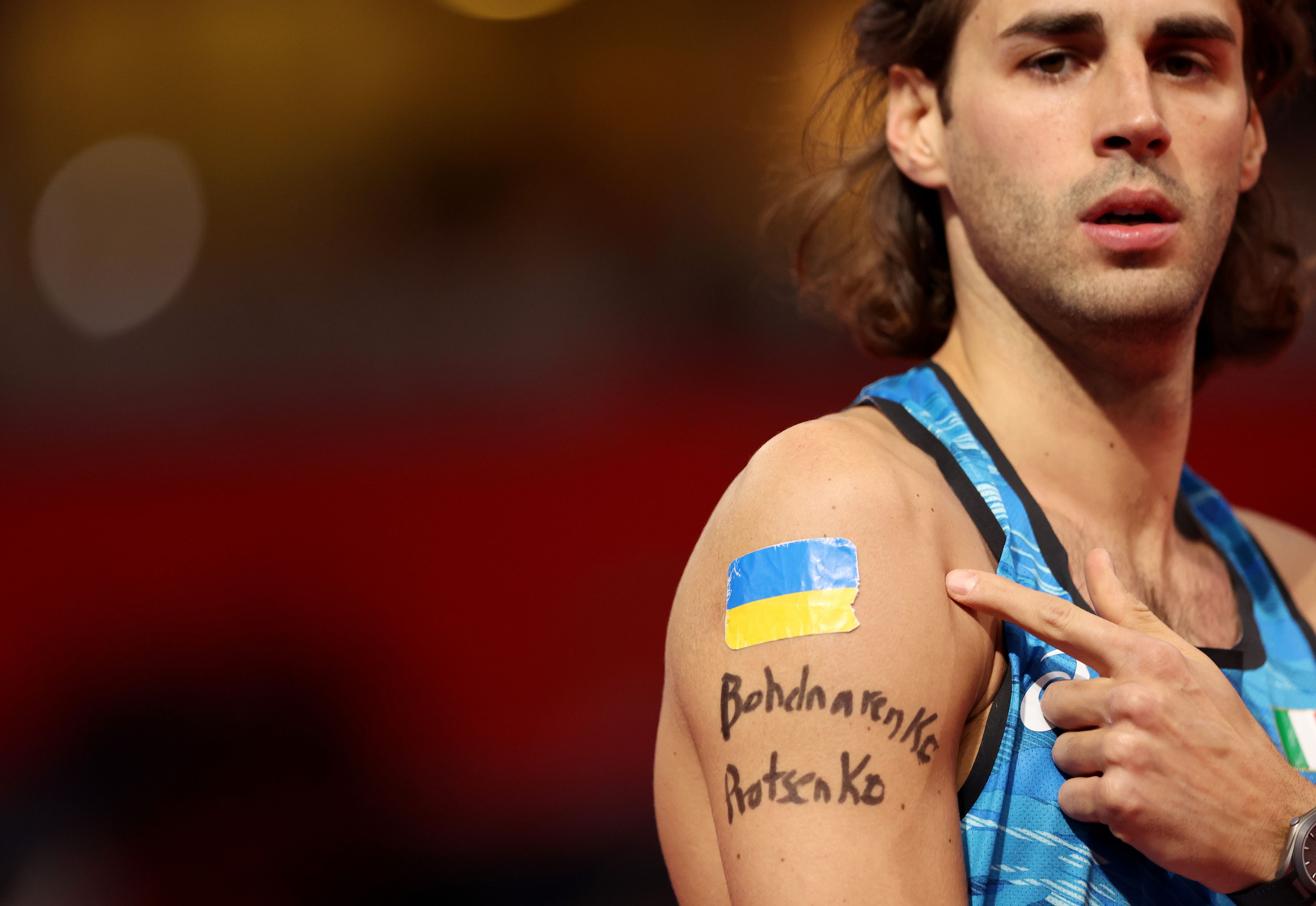 Gianmarco Tamberi a Belgrado con una piccola bandiera dell'Ucraina sul braccio e due nomi: Bodhan Bondarenko e Andriy Protsenko, due saltatori ucraini che non sono riusciti ad arrivare ai Mondiali di Belgrado.