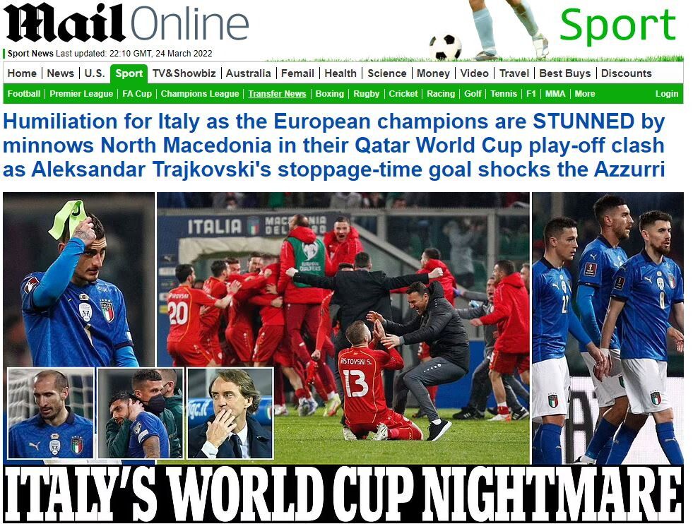 La clamorosa sconfitta contro la Macedonia del Nord, costata la qualificazione al Mondiale per la seconda volta di fila all'Italia, ha fatto il giro del mondo sia sui giornali e siti sportivi che non. "Tragedia italiana, epica Macedonia del Nord" il titolo dello spagnolo Marca. "Coppa del Mondo incubo dell'Italia" l'apertura della sezione Sport del Daily Mail. "Quali-disastro" il commento del tedesco Bild. Scorri la gallery per scoprire le reazioni dall'estero.