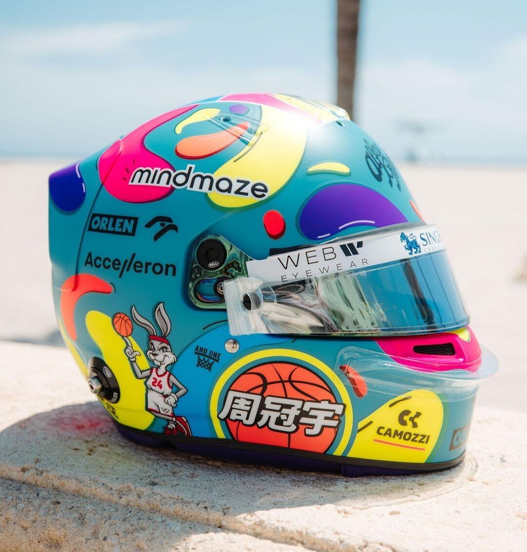 Sarà un GP di Miami ricco di caschi speciali: Guanyu Zhou si è ispirato al basket. Per il pilota cinese dell'Alfa Romeo un coniglio in tenuta da cestita e il classico azzurro della città della Florida.