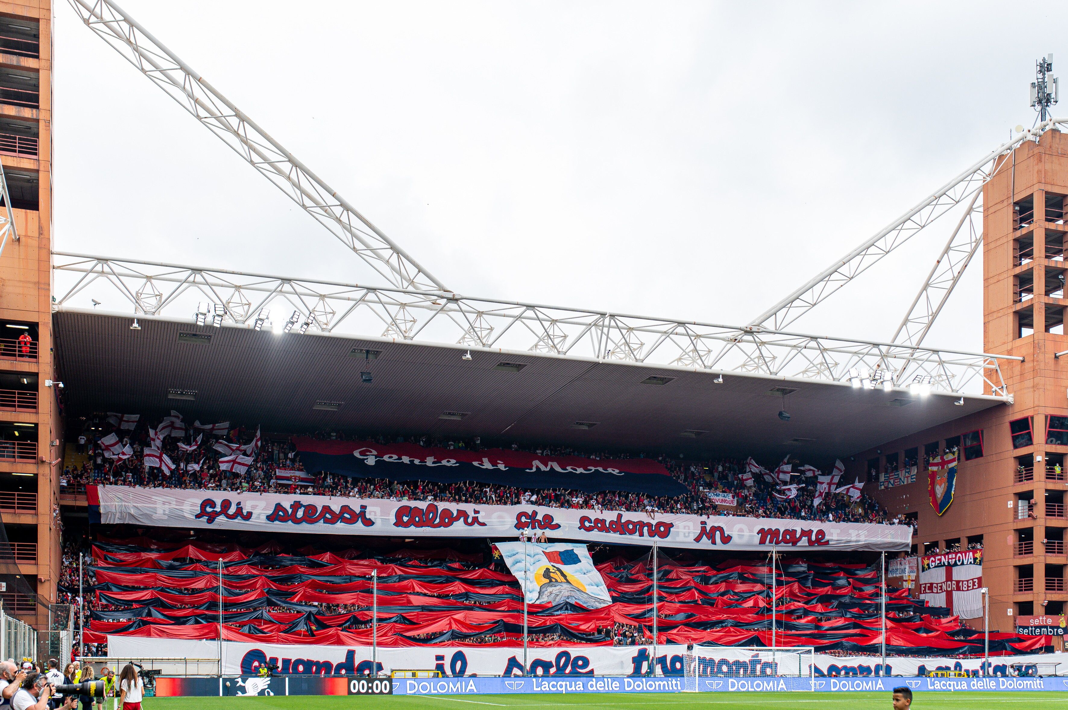 Coreografia e cori da parte dei tifosi del Genoa che nonostante la retrocessione non contestano la squadra. La Gradinata Nord anzi, colorata di rossoblù, ha inscenato anche una coreografia speciale. Due enormi striscioni: uno nella parte superiore "Gli stessi colori che cadono in mare" e uno in quella inferiore "quando il sole tramonta senza salutare" hanno fatto da cornice a decine di striscioni rossi e blu a simboleggiare le onde del mare mentre in mezzo alla Gradinata un enorme disegno raffigurava una bandiera rossoblù sopra uno scoglio. E dopo la coreografia i tifosi hanno incitato la squadra per quella che è già stata definita come la giornata dell'orgoglio rossoblù.