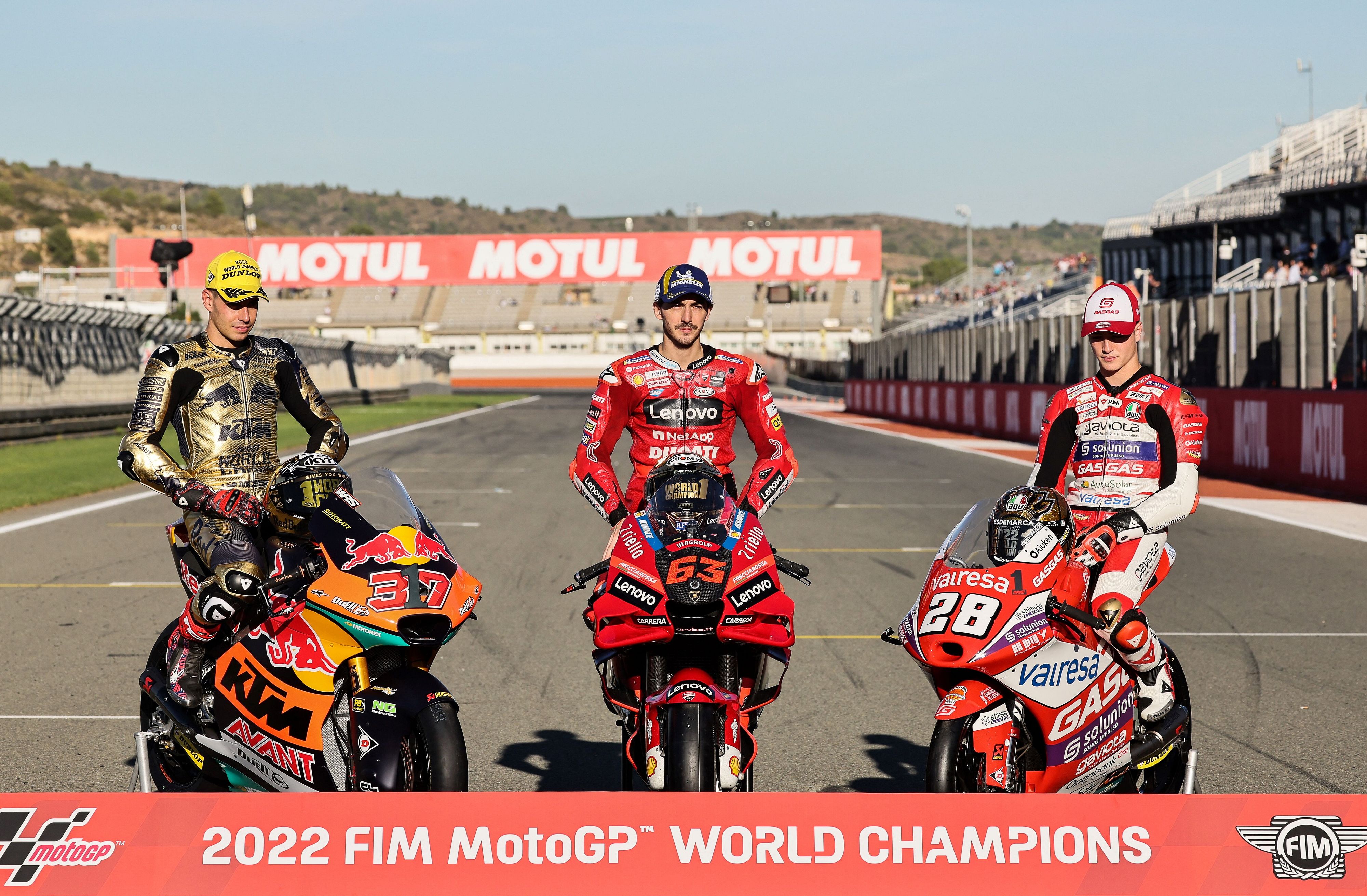 Subito dopo la gara di Valencia, i nuovi campioni del mondo della MotoGP, della Moto2 e della Moto3 si sono messi in posa per le foto di rito. Francesco Bagnaia, Augusto Fernandez e Izan Guevara hanno così posato in sella alle loro moto.