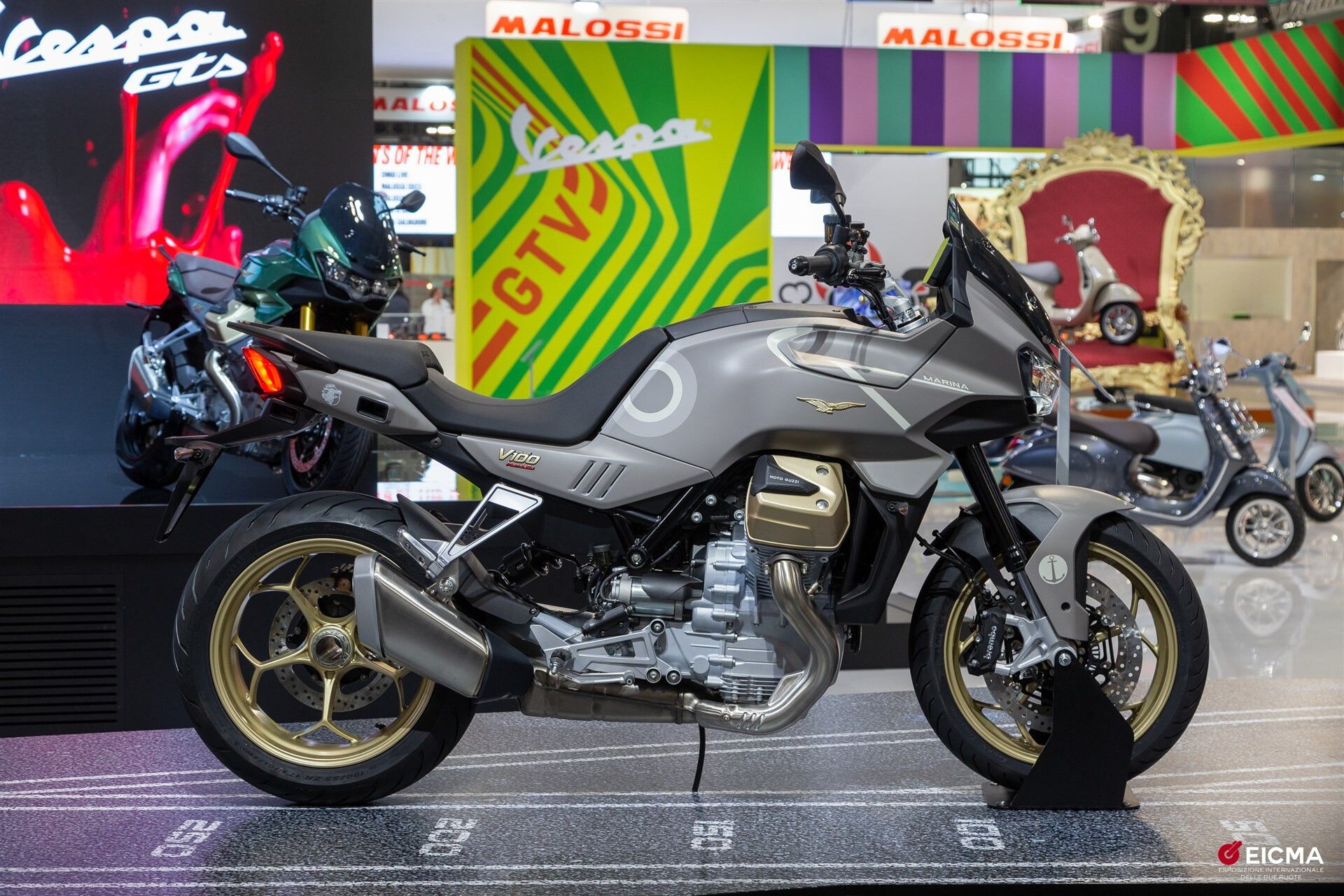 Novità a Eicma per Moto Guzzi. V100 Mandello apre un capitolo tutto nuovo nella storia Moto Guzzi. V100 Mandello è innovativa a partire dal design che, come sempre, parte dalla valorizzazione del bicilindrico, unico e inimitabile. Una svolta nella storia del marchio, portando all’esordio molte importanti innovazioni tecnologiche: la prima motocicletta con aerodinamica adattativa, la prima Moto Guzzi dotata di evolute soluzioni elettroniche come la piattaforma inerziale a sei assi, il cornering ABS, le sospensioni semiattive e il quick shift, solo per citare le più importanti. Ed è la prima Moto Guzzi spinta dal nuovo propulsore “compact block”, dalle raffinate caratteristiche tecniche. La tradizione è rispettata dall’architettura a V trasversale di 90° del bicilindrico, che garantisce quel modo unico di erogare la coppia e quel sound inimitabile Moto Guzzi, ma il progetto è totalmente nuovo e vanta prestazioni decisamente brillanti: la potenza è di 115 CV a 8.700 giri/min e la coppia massima di 105 Nm a 6.750 giri/min, con l’82% disponibile già da 3.500 giri/min e il limitatore fissato a ben 9.500 giri/min. La V7 Stone Special Edition è la prima inedita proposta della V7 Stone dal carattere decisamente dinamico. Abbandona le tinte opache tipiche della versione Stone - la più contemporanea della famiglia V7 - per vestire la speciale colorazione lucida dedicata Shining Black, arricchita sul serbatoio da grafiche con dettagli rossi che richiamano la tradizione stilistica dei modelli più sportivi dell’Aquila. Una sportività sottolineata anche dalle molle degli ammortizzatori verniciate in rosso e dalle cuciture rosse a contrasto della sella, anch’essa dedicata a questo modello unico. Una targhetta sul riser del manubrio ne identifica l’edizione speciale. L’allestimento prevede inoltre gli specchi retrovisori “bar end” e il tappo per il rifornimento in alluminio ricavato dal pieno anodizzato nero. Le personalizzazioni si estendono anche al twin 850 Moto Guzzi, con i coperchi delle teste in un inedito color grafite e le protezioni dei corpi farfallati in alluminio anodizzato nero. L’aspetto più ‘muscolare’ è enfatizzato dall’impianto di scarico by Arrow con terminali marchiati Moto Guzzi, grazie al quale la Moto Guzzi V7 Stone Special Edition guadagna anche migliori prestazioni, sia sul fronte della potenza, che sale da 48 a 49 kW (66,5 CV) a 6700 giri/min, sia della coppia massima, che cresce da 73 a 75 Nm a 4900 giri/min.È la versione speciale di V9 Bobber, la custom sportiva di Moto Guzzi che ha introdotto il genere bobber di media cilindrata, caratterizzato dal look quasi completamente total black di ogni componente e dai grossi pneumatici oversize che garantiscono un’ampia impronta a terra, proprio come quelli montati sulle motociclette che nel secondo dopoguerra negli States si sfidavano su veloci piste in terra battuta. L’equipaggiamento di V9 Bobber Special Edition è da vera fuoriserie e vanta innanzitutto una speciale colorazione Workshop twin-tone nera e grigia che impreziosisce il serbatoio a goccia in metallo (dotato di tappo in alluminio ricavato dal pieno) e si estende anche ai fianchetti in alluminio. Gli specchietti bar-end fissati alle estremità del manubrio, assieme ai soffietti della forcella e al parafango anteriore corto completano la dotazione, amplificando la sensazione di qualità percepita davvero elevata. L’inconfondibile sound del twin 850 Moto Guzzi è evidenziato dagli scarichi slip-on omologati verniciati in nero opaco e con fondello in alluminio e caratterizzati, nella parte terminale, da una slanciata sagomatura obliqua.