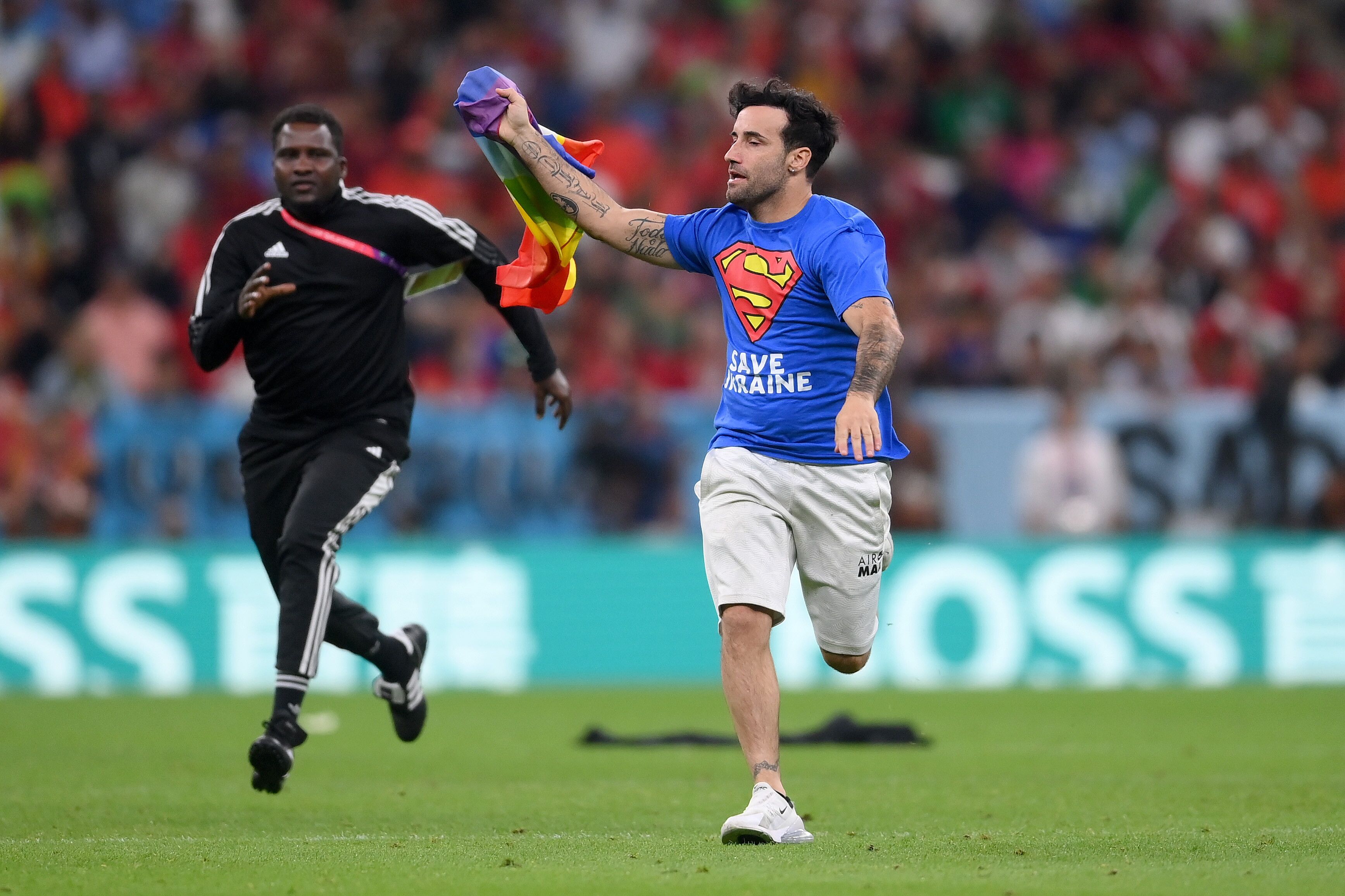 Mario Ferri, per tutti "il Falco", è tornato ad invadere un campo di calcio durante un evento internazionale. L'invasore italiano ha interrotto Portogallo-Uruguay vestendosi di messaggi importanti in difesa delle donne iraniane e dell'Ucraina ('Save Ukraine', e 'Respect for Iranian Woman'), il tutto con la contestata bandiera arcobaleno in mano. Dopo essere stato trattenuto qualche ora il Falco, primo protagonista di un'azione del genere in un match dei Mondiali in Qatar, è stato rilasciato e nei suoi confronti non sarebbe stato preso nessun provvedimento.