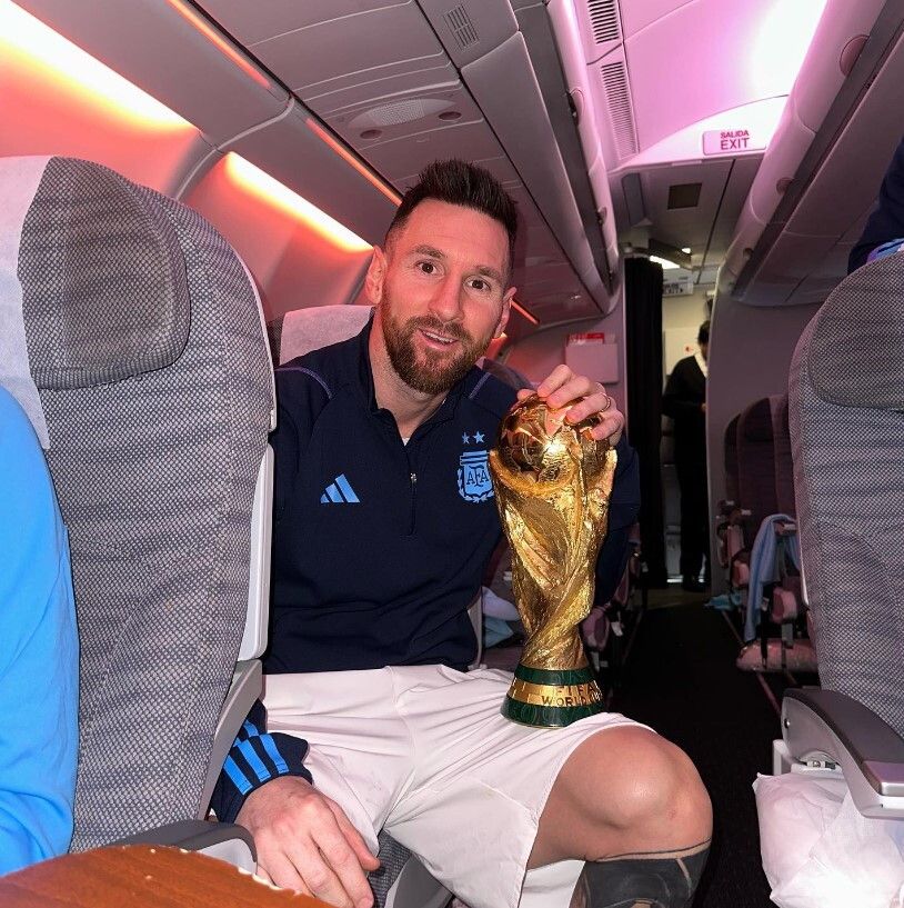 In attesa di rientrare in Patria, l'Argentina festeggia anche in volo. Messi & Co. hanno infatti scattato alcune foto con la Coppa del Mondo sull'aereo che li sta riportando a casa e pubblicato tutto durante lo scalo in Italia.