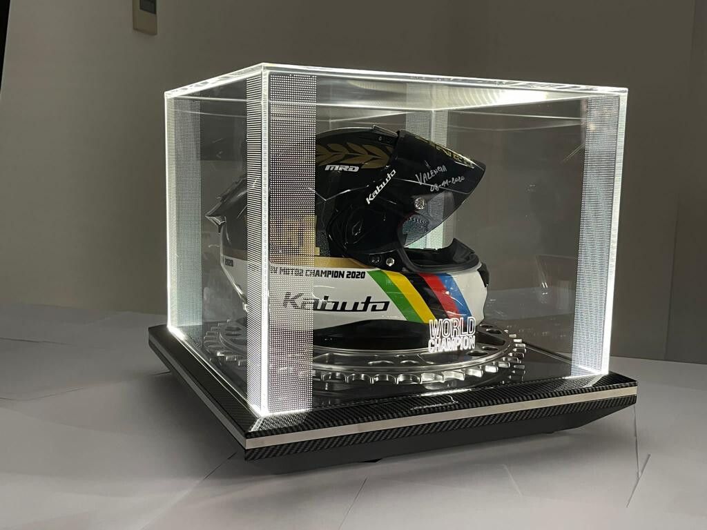 "Dietro ogni casco c'è una storia, dietro ogni storia c'è la passione", da qui nasce One, l'elegante teca realizzata per conservare i cimeli più importanti del mondo motoristico. Idea creativa di Massimiliano Ripamonti, manager di alcuni piloti del Motomondiale, sviluppata in collaborazione con l'Interior Designer Maurizio Argenti. Teca lussuosa in plexiglass Black Light dal design raffinato ispirato al mondo delle corse, dotata di un esclusivo motore rotante e di illuminazione a led. Ispirata al mondo delle corse non potevano mancare le finiture in carbonio. Oltre 50 ore per realizzare una teca One, ogni minimo particolare e la finitura sono al top di gamma. I nostri maestri artigiani realizzano ogni teca One con la massima cura, ogni teca è unica e preparata in esclusiva. (Info su https://www.one1mr.com/)