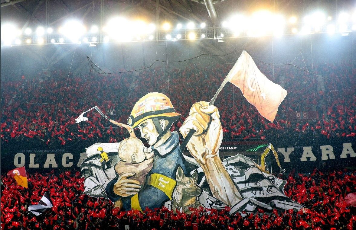 Prima dello spareggio di Conference League contro il Basilea, i tifosi del Trabzonspor hanno ricordato le vittime del terribile terremoto in Turchia con una emozionante coreografia. L'immagine ritrae un soccorritore che stringe tra le braccia un bimbo con il suo fido cane di fianco, mentre una mano sventola la bandiera turca.