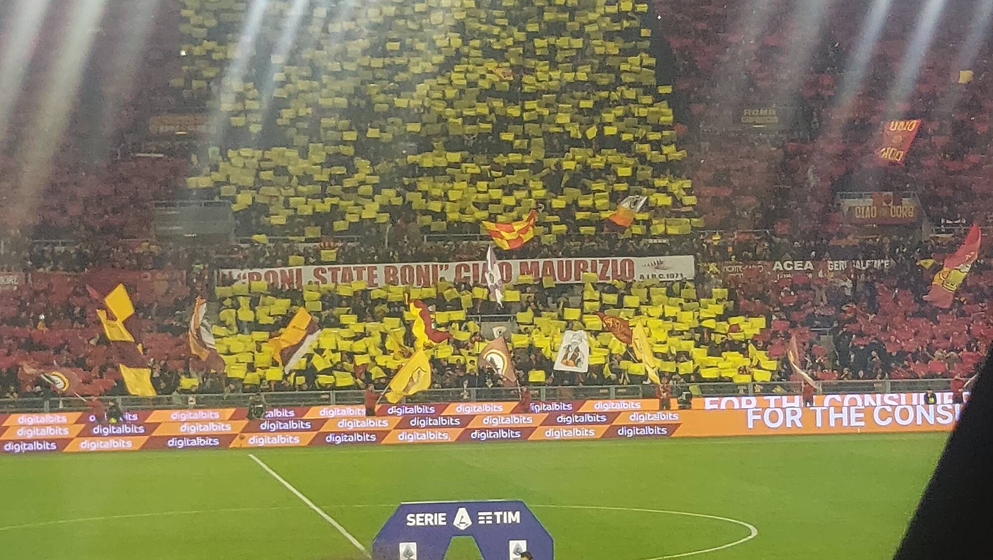 Coreografia da brividi all'Olimpico per Roma-Juve. Durante l’inno 'Roma Roma Roma' tutto lo stadio - eccezion fatta per la curva Sud - è stato colorato di giallo e di rosso grazie a dei cartoncini lasciati sugli spalti dalla società. Le due tribune e la Curva Nord sono state colorate dall’inizio dell’inno fino a quando non è iniziata la partita. Dalla Tribuna Tevere è arrivato anche il saluto a Maurizio Costanzo, scomparso pochi giorni fa: “Boni, state boni, ciao Maurizio”, recitava lo striscione comparso in tribuna prima dell’inizio della partita.