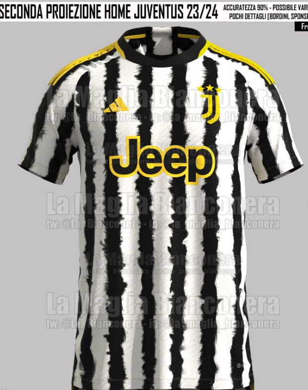 Strisce nere a colore pieno ma dai bordi zebrati - a richiamare l'animale da sempre associato alla Juventus per i colori - e dettagli di giallo vivo (logo, sponsor tecnico e contorno dello sponsor principale): queste le anticipazioni sulla prossima prima maglia bianconera per la stagione 2023/24. Posteriormente sfondo nero e scritte bianche per nome e numero del calciatore e bordino giallo. Le foto sono di "La maglia bianconera".